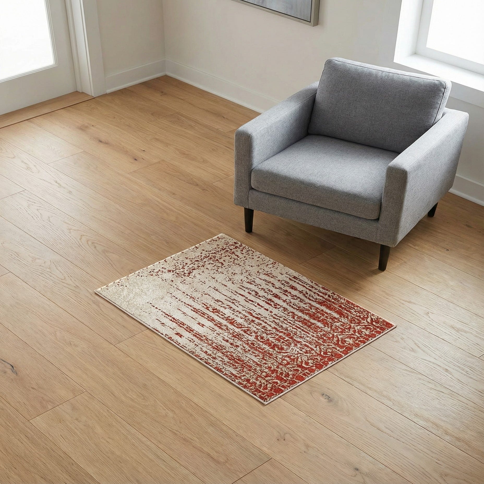 The Angelica collection offers a 2x3 rug that showcases a modern approach to traditional designs. This machine-woven piece is crafted from 100% polypropylene, presenting a durable and easy-to-maintain surface. The vivid red background is accented with a gradient pattern that melds into subtle, ornate motifs, giving the rug a unique, distressed appearance. Accent colors of beige, terracotta, and light brown weave throughout the piece, enhancing its visual depth and appeal.