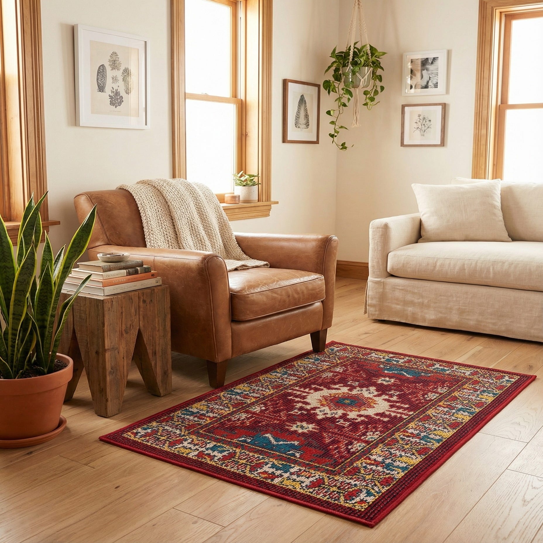 Place it in a covered patio, sunroom, or high-traffic entryway to add color without overwhelming the space. It pairs naturally with rattan or wicker seating and linen upholstery, or layer it over a larger neutral jute to introduce a warm, patterned focal point. The red and navy tones work well with rustic and Southwestern palettes, while the pops of yellow and pink can brighten a coastal or eclectic scheme.