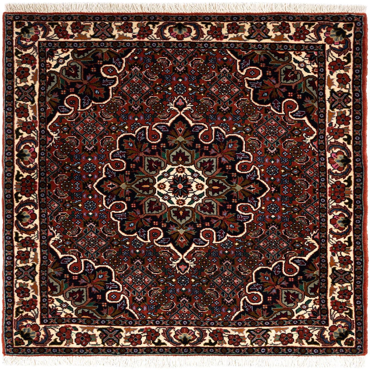 A 2x3 rectangular Bidjar wool rug featuring a complex traditional pattern in rich reds, creams, and dark accents, with white fringe.