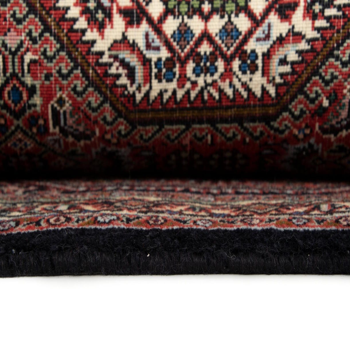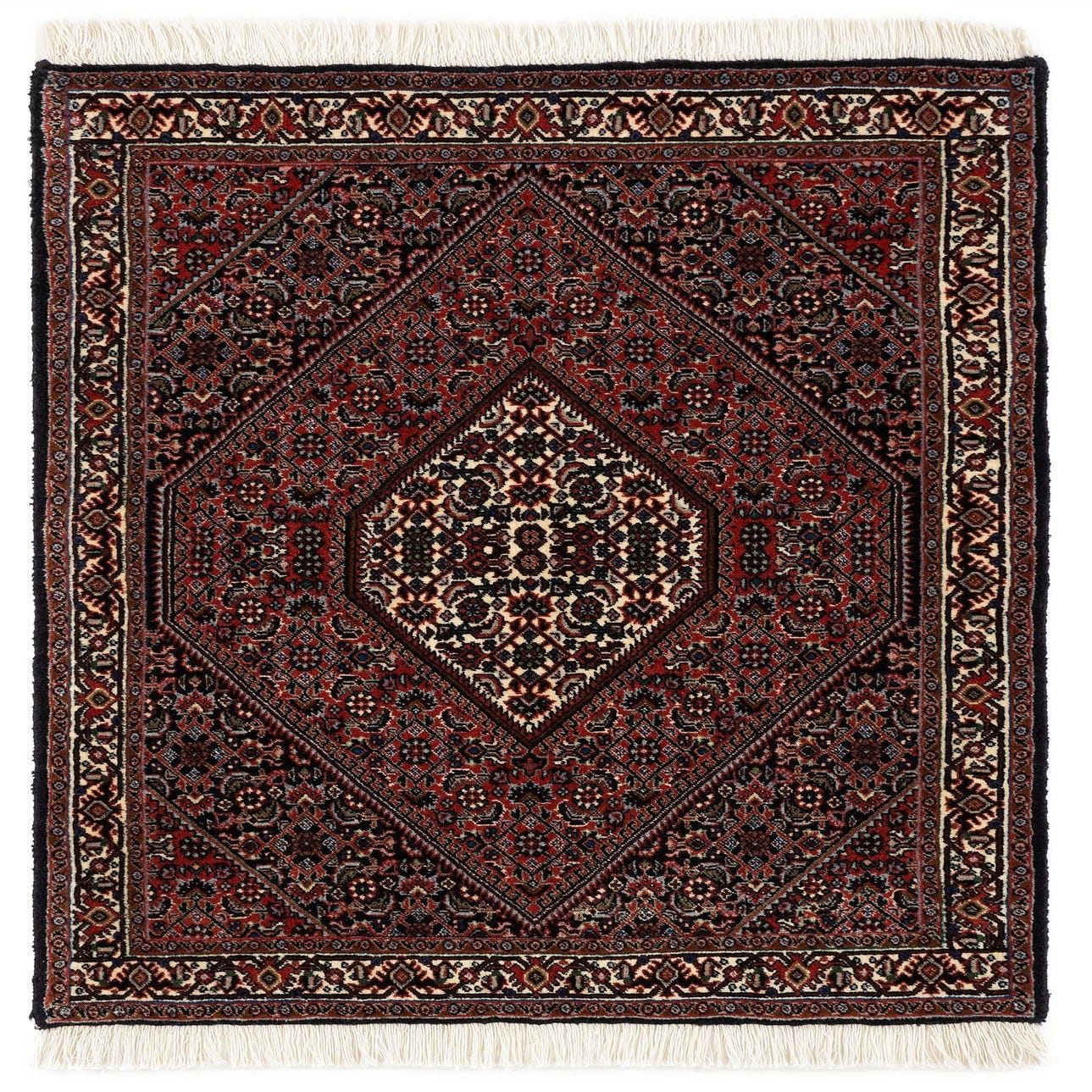 A 2x3 rectangular Bidjar With Silk rug featuring a rich red and black traditional pattern with a central diamond medallion and white fringes.