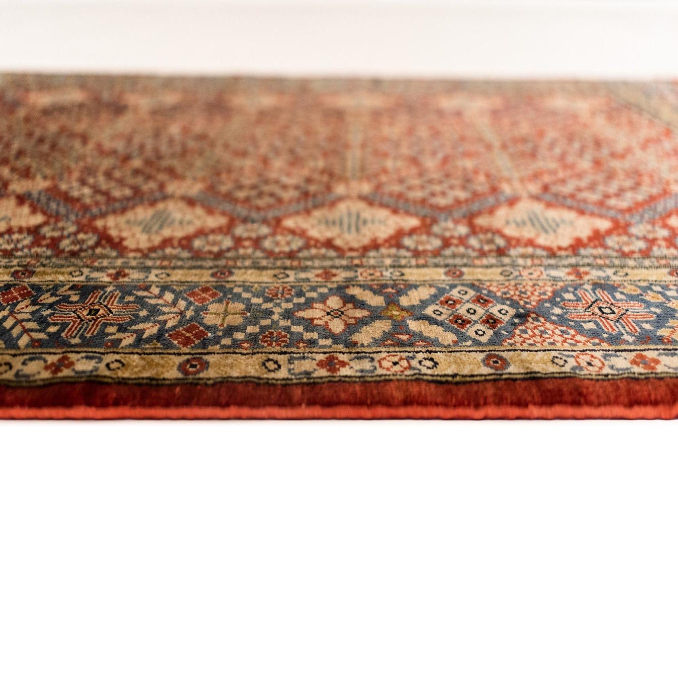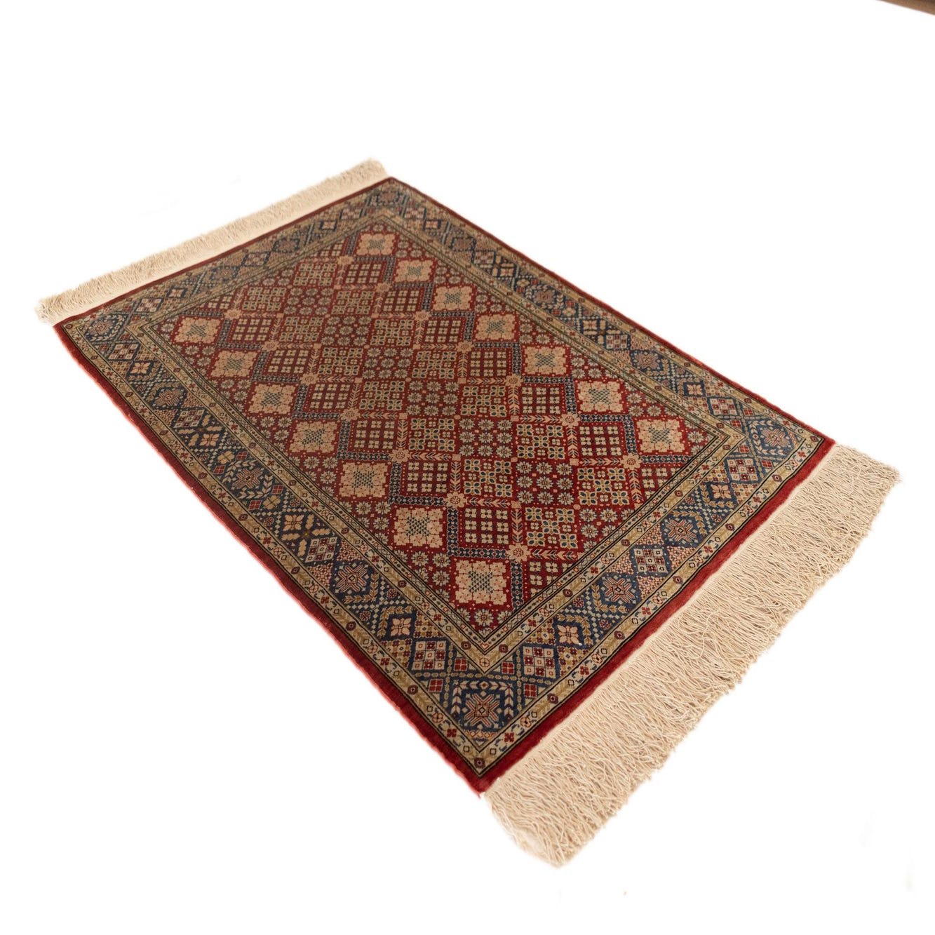 A 2x3 rectangular Hereke Silk Persian rug featuring a rich red field with intricate floral and geometric patterns in blue, gold, and cream, framed by a detailed border and finished with cream fringes.