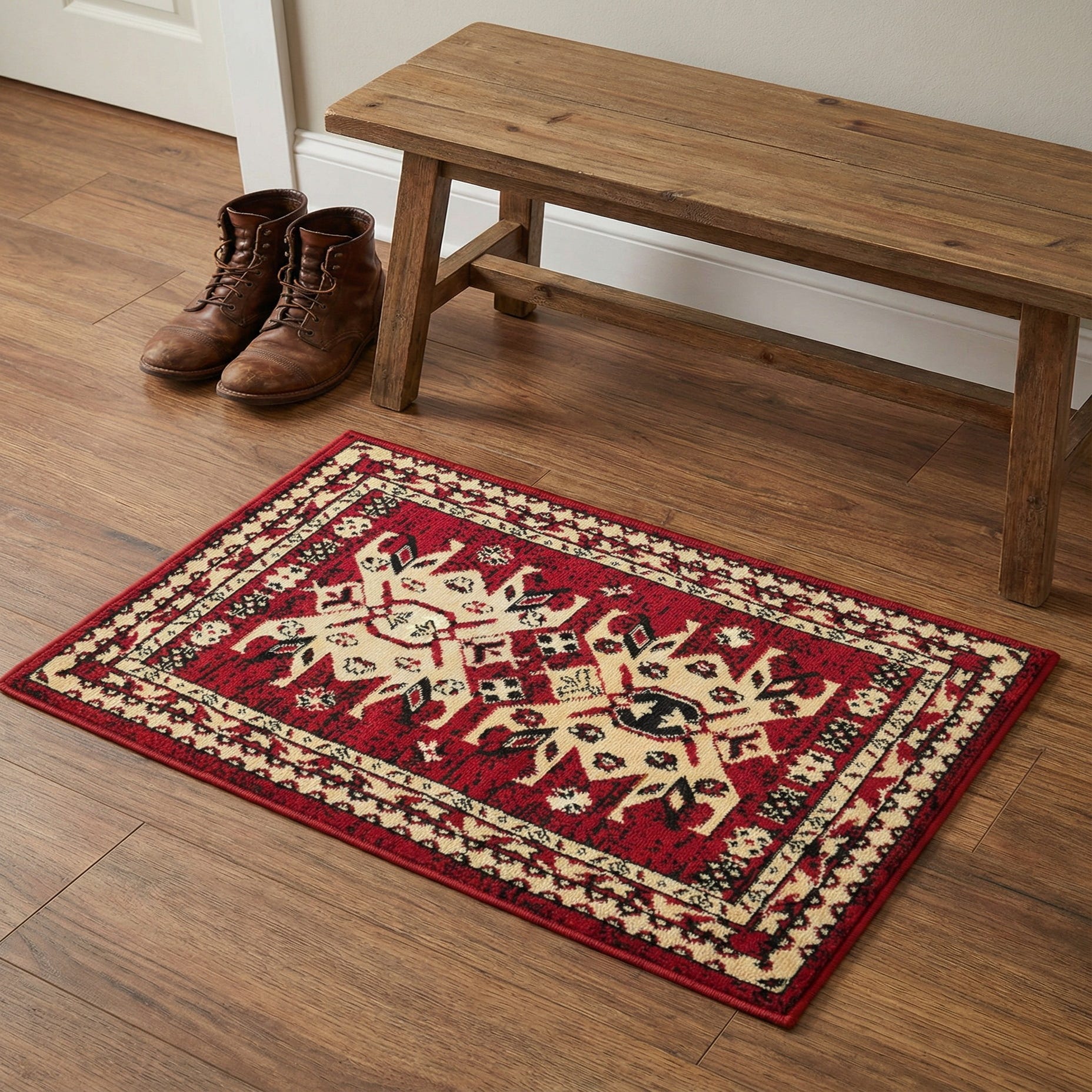 This piece works well as an entryway mat or layered in a small seating area to anchor a chair and side table. Pair it with warm wood furniture, leather seating, or neutral upholstery to balance the strong red ground; the black and cream details also make it a natural fit for interiors that mix traditional elements with rustic or industrial accents. It can also add a focused pop of color to a hallway or reading nook without overwhelming a compact space.