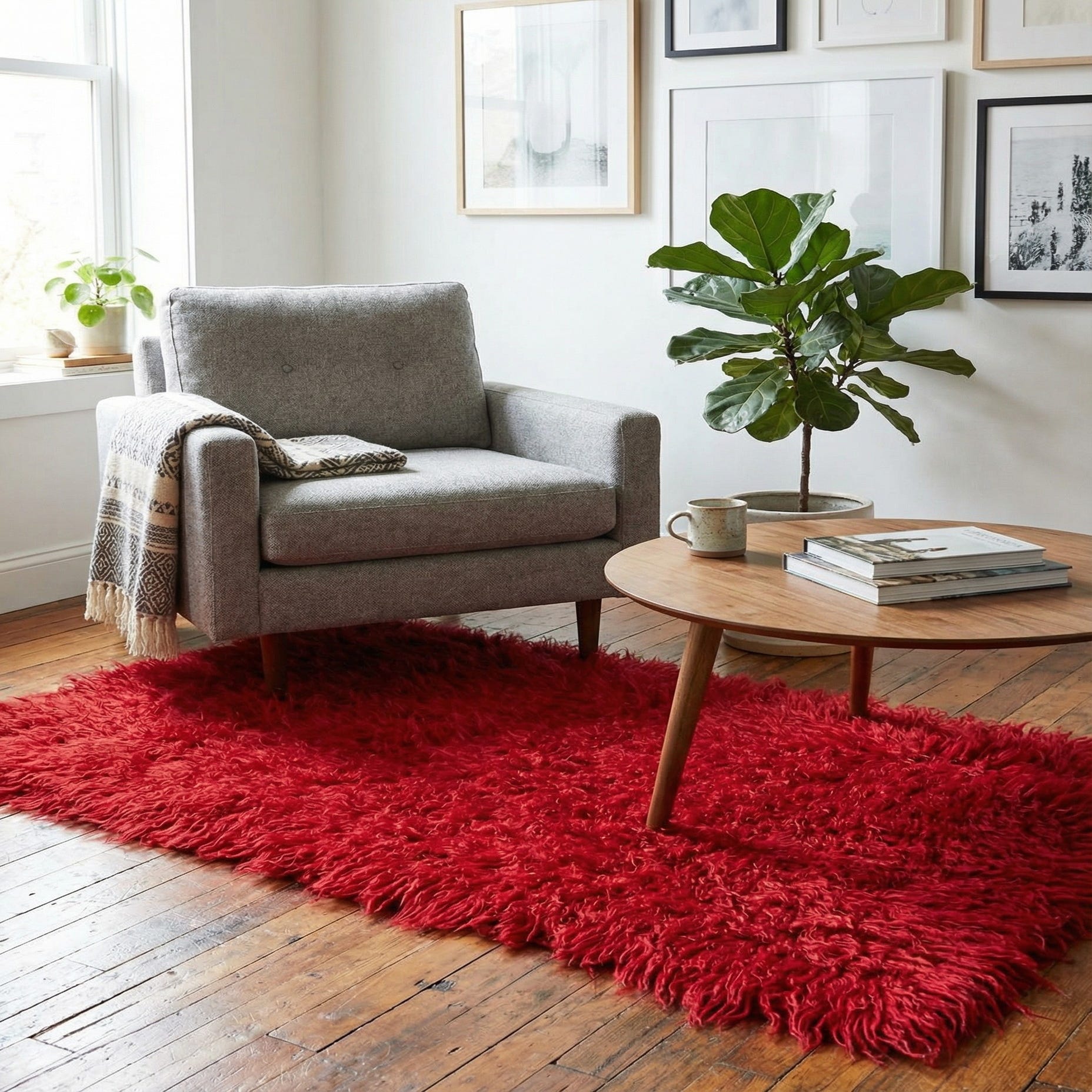 A vibrant red 2x3 rectangular shag rug, handmade from wool, featuring a plush, textured pile.