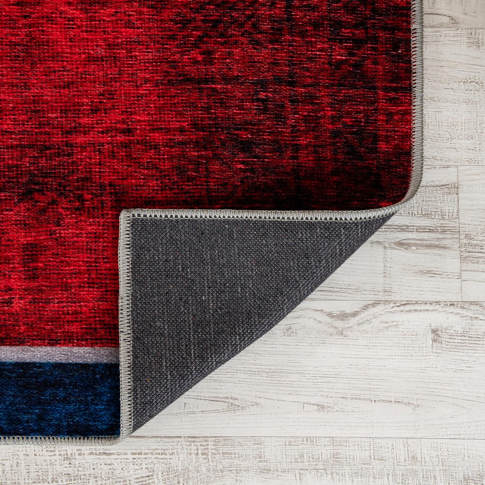 A bold, flag-inspired pattern anchors this rug with a wide red field punctuated by a central navy roundel carrying three ivory stars and a narrow blue stripe along one edge. The surface carries a deliberately distressed, overdyed look that lets faint ornamental border motifs peek through the red, giving the design a vintage, lived-in character. Machine made from 100% chenille, the pile feels soft and slightly velvety underfoot while the low profile keeps the texture refined and comfortable.