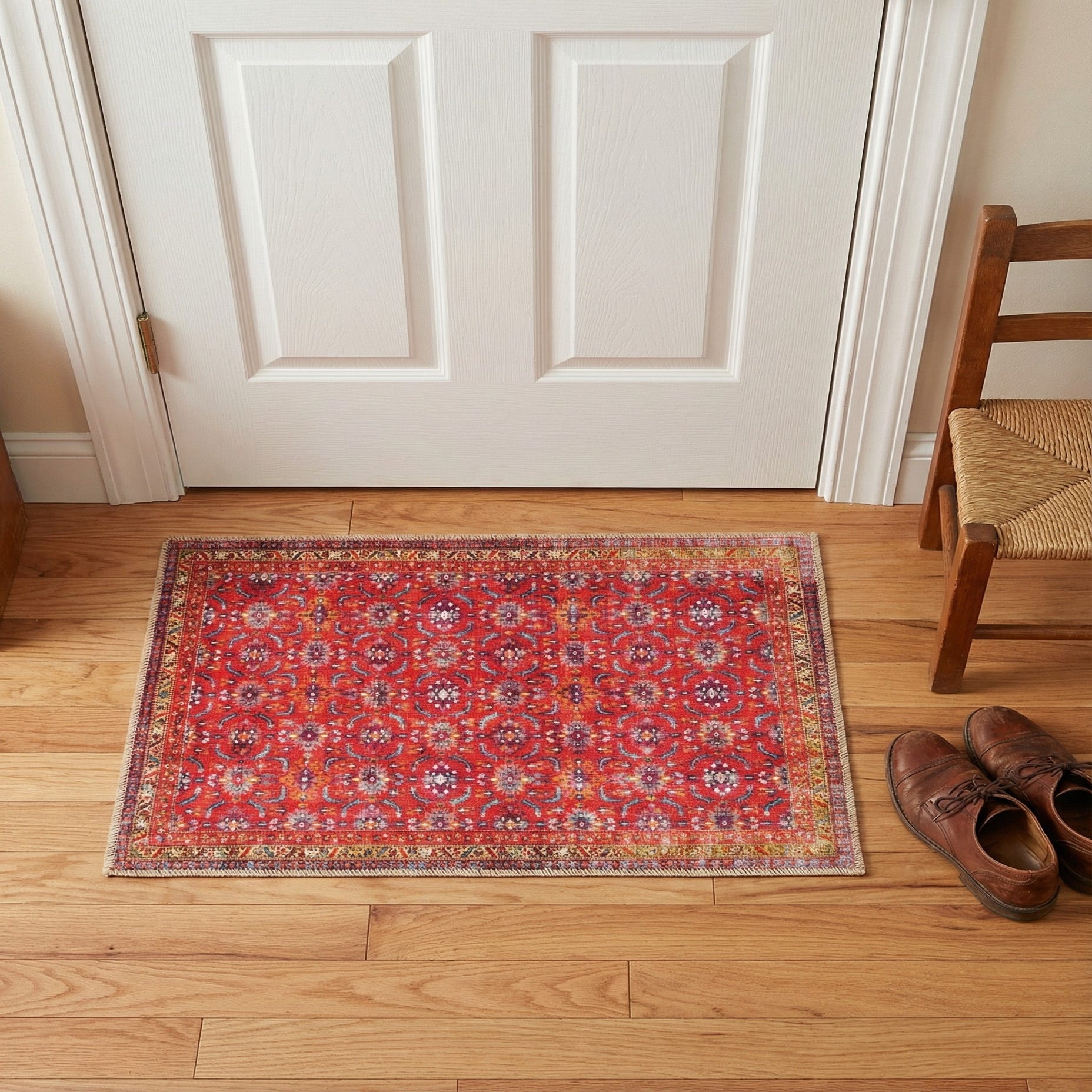Primary color is Red. Colors in this rug include: Red, Beige, Black, Blue, Ivory, Violet, Gold, Green.