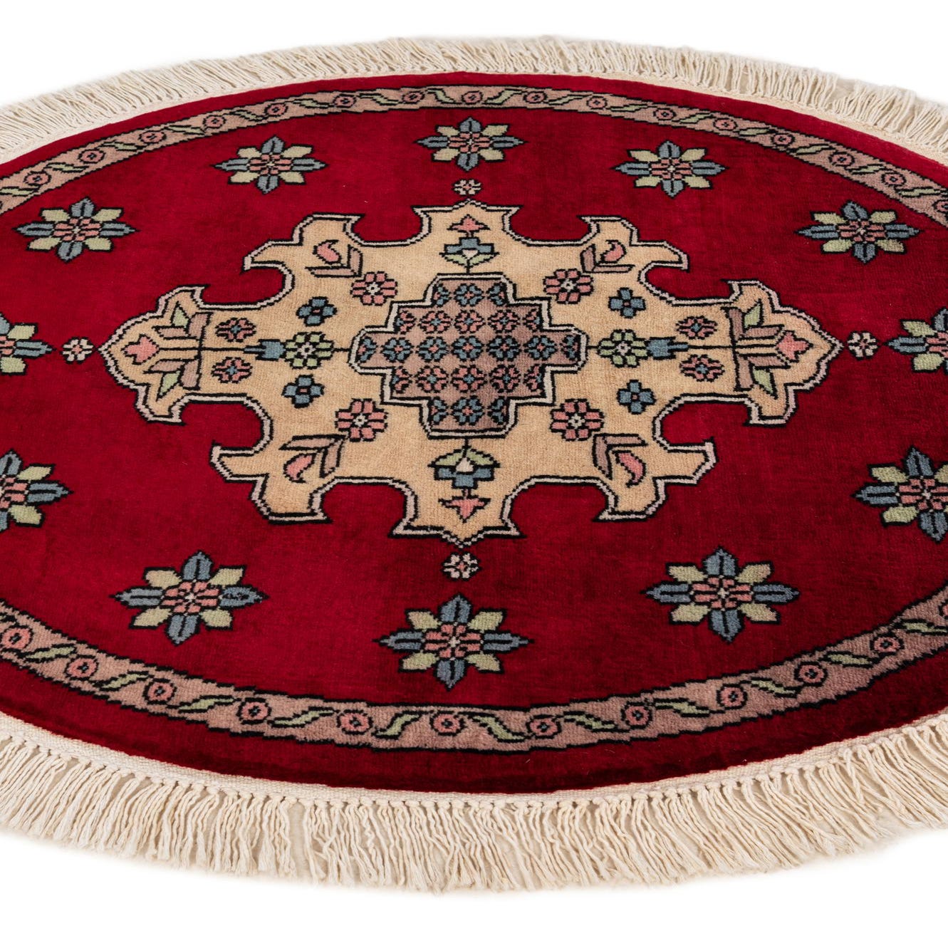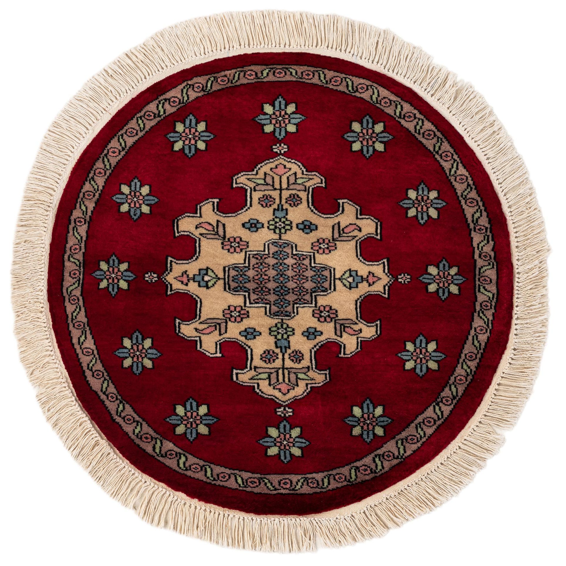 A 2' 7 x 2' 8 round red Bokhara rug with a central medallion and floral tribal patterns, featuring cream fringes.