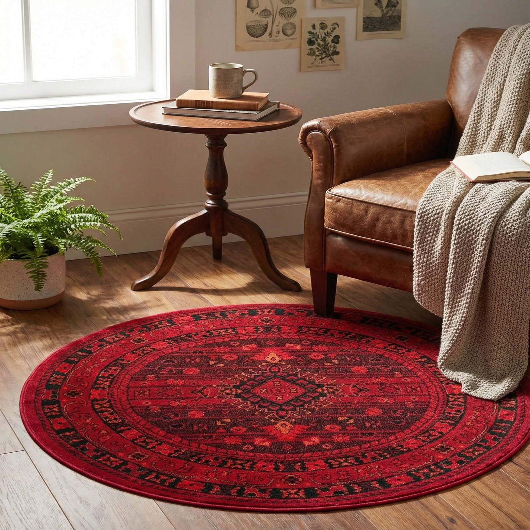 Machine-made from 100% polypropylene, the rug has a low, even pile with a soft, slightly lustrous finish that feels pleasant underfoot. Its compact profile works well beneath a small round bistro table, beside a bed, or in an entry or reading nook where a focused pop of color is desired. Pair it with warm wood tones, cream or neutral upholstery and terracotta accents for a cohesive look, or use black metal furnishings and simple linens to let the rug’s pattern be the focal point in a transitional or vintage-inspired space.