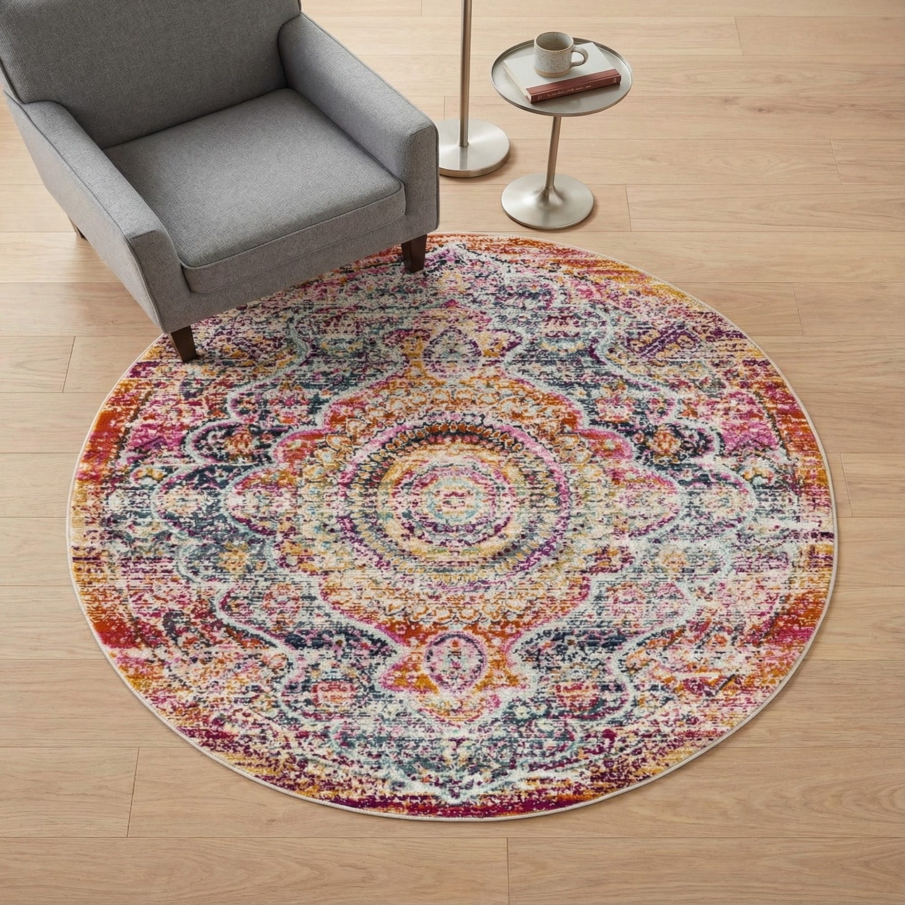 This rug works well as a focal point in an eclectic living room or a cozy reading nook, and it pairs nicely with warm wood furniture, neutral upholstery, and brass or matte-black accents. Use it under a small round dining set to bring color to a breakfast corner, or layer it over a larger neutral rug in a bohemian or transitional space to add pattern and warmth.