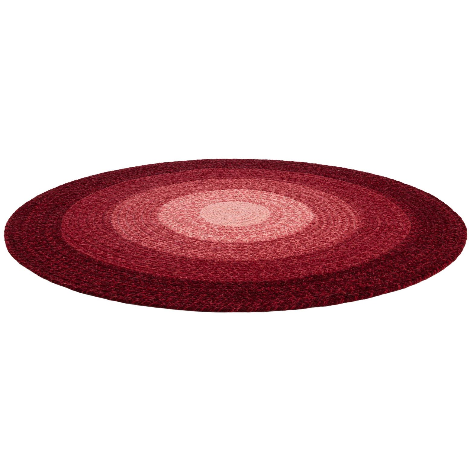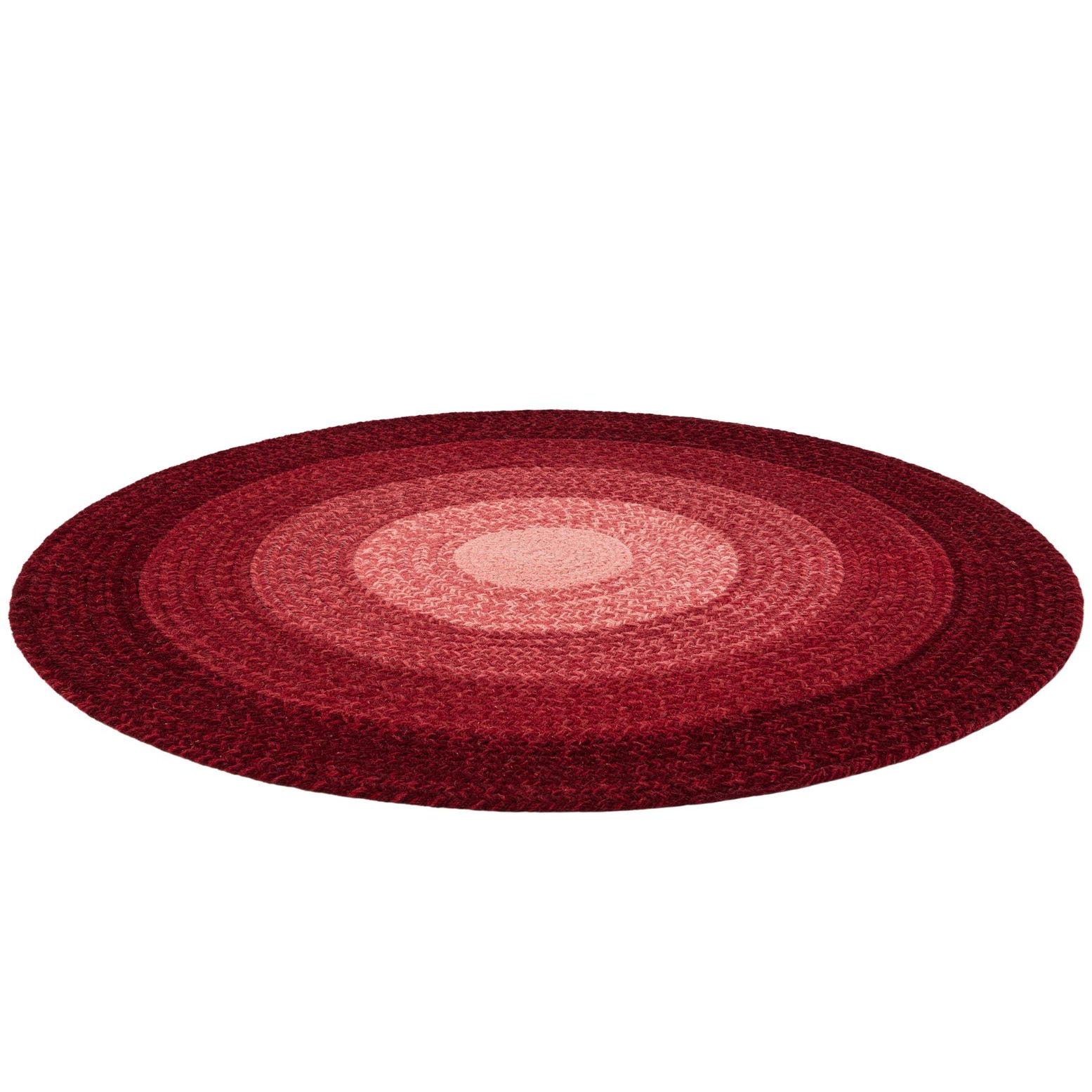 A 3' 1 x 3' 1 round, hand-braided wool rug featuring concentric circles in varying shades of red, from light to deep.