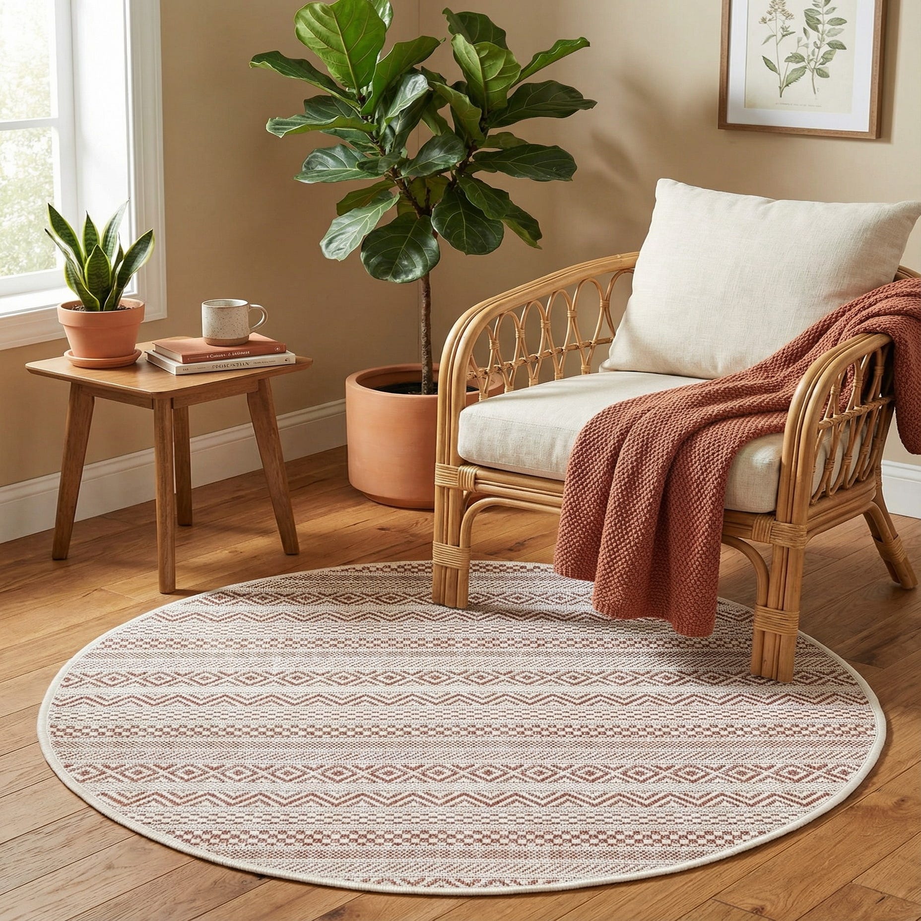 This round piece works well as an outdoor accent for a bistro set, balcony seating, or a front porch, and it also translates indoors to kitchens, mudrooms and casual dining nooks. Pair it with natural wood or rattan furniture, crisp white cushions, and matte black or brass accents for contrast, or layer it under a small round table to introduce color and pattern to a compact space.