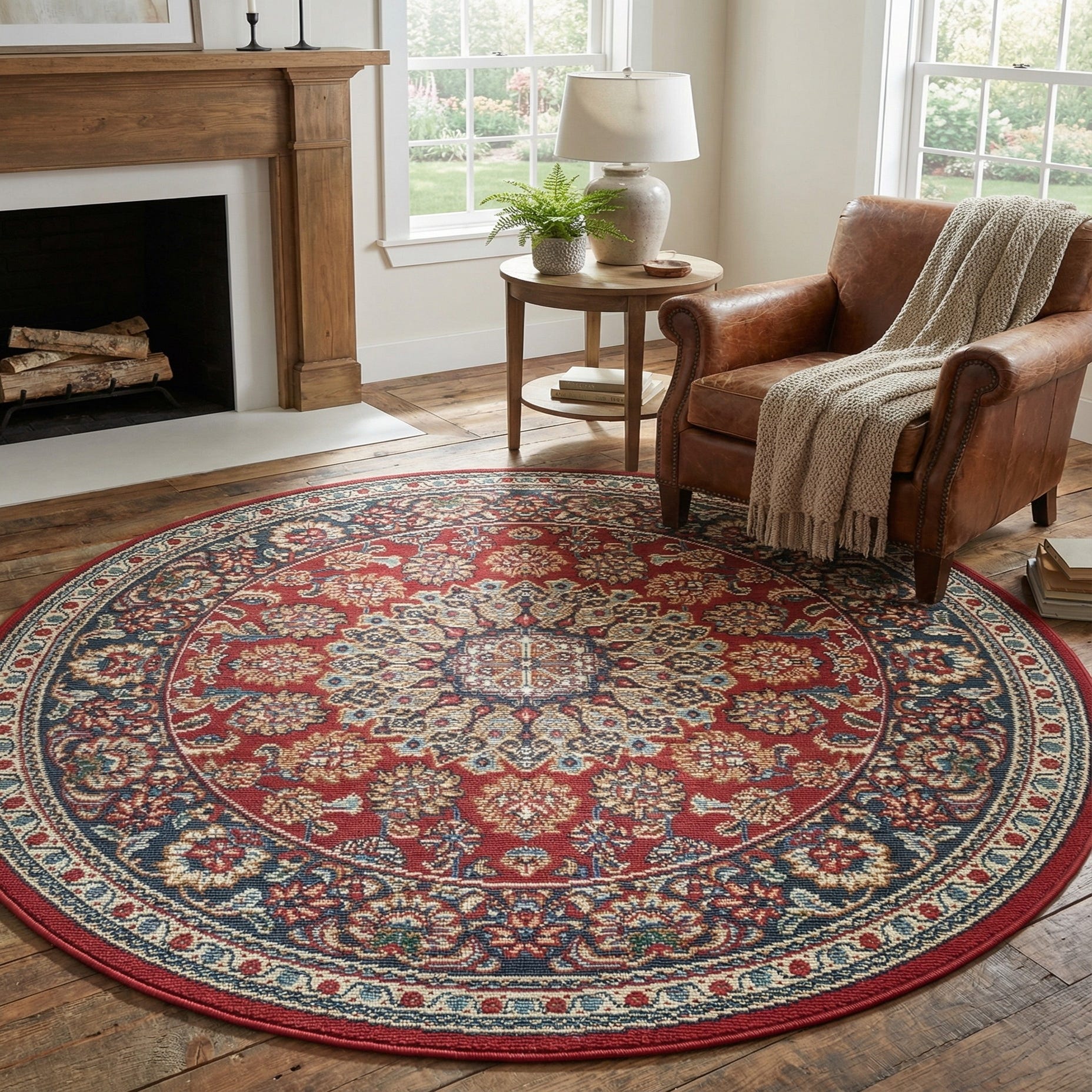 A traditional medallion layout anchors this round rug, with a rich red background that makes the central ivory-and-beige starburst stand out. Layers of floral sprays, scrolling vines and detailed guard borders in navy blue, brown, green and ivory create a classic Persian-inspired look. The pattern is finely detailed and balanced—an ornate central motif radiates into smaller blossoms and leafy accents, while a navy outer band framed by ivory motifs gives the piece a finished, composed edge.