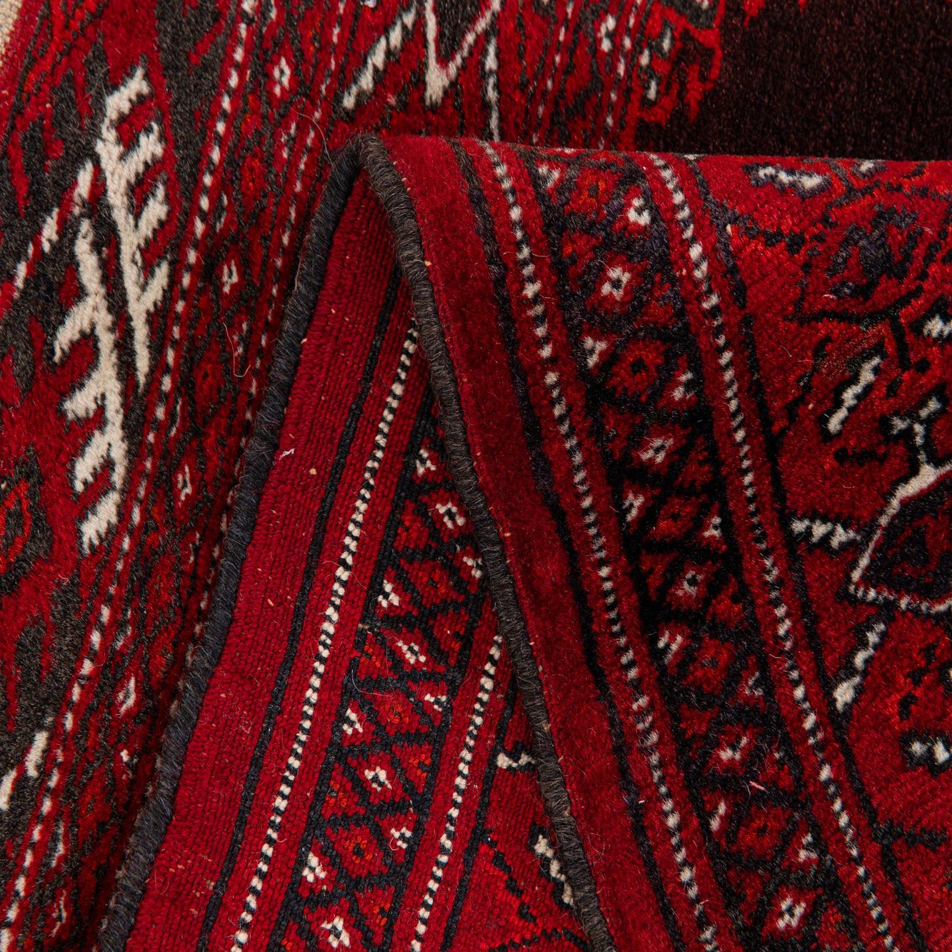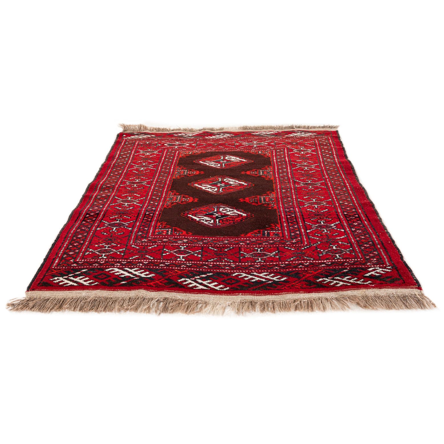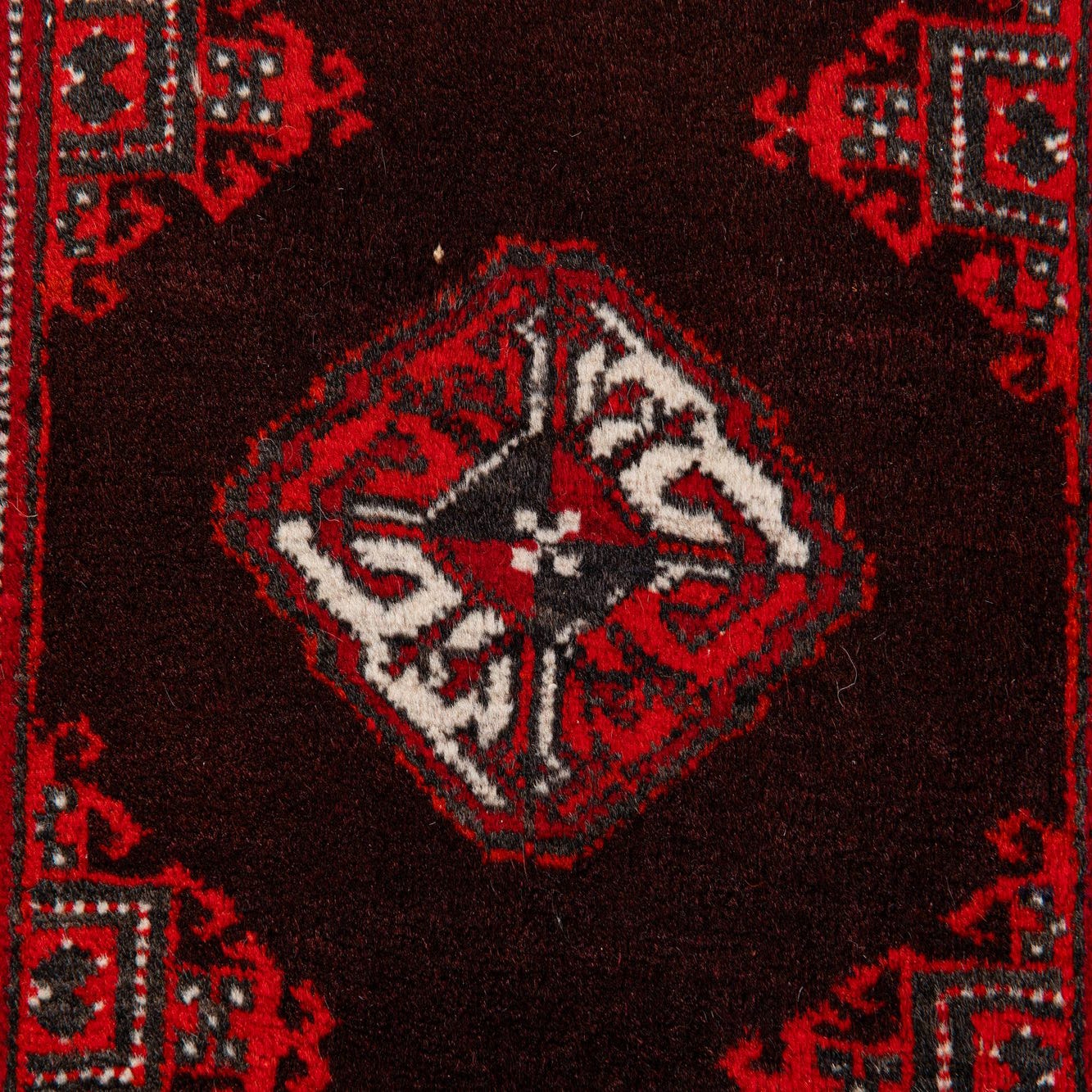 A 2' 7 x 3' 4 square Afghan Akhche rug featuring a deep red border with intricate tribal patterns and a dark brown center with three prominent white, red, and black diamond motifs, finished with natural fringe.