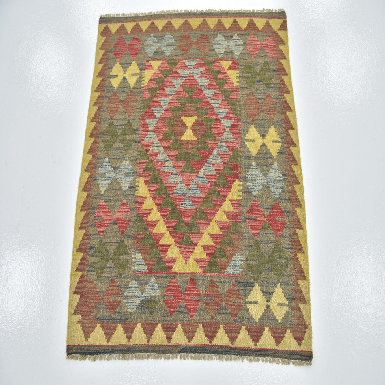 A 3' 2 x 3' 7 square Kilim Maymana wool rug featuring a tribal medallion pattern in reds, yellows, greens, and blues.