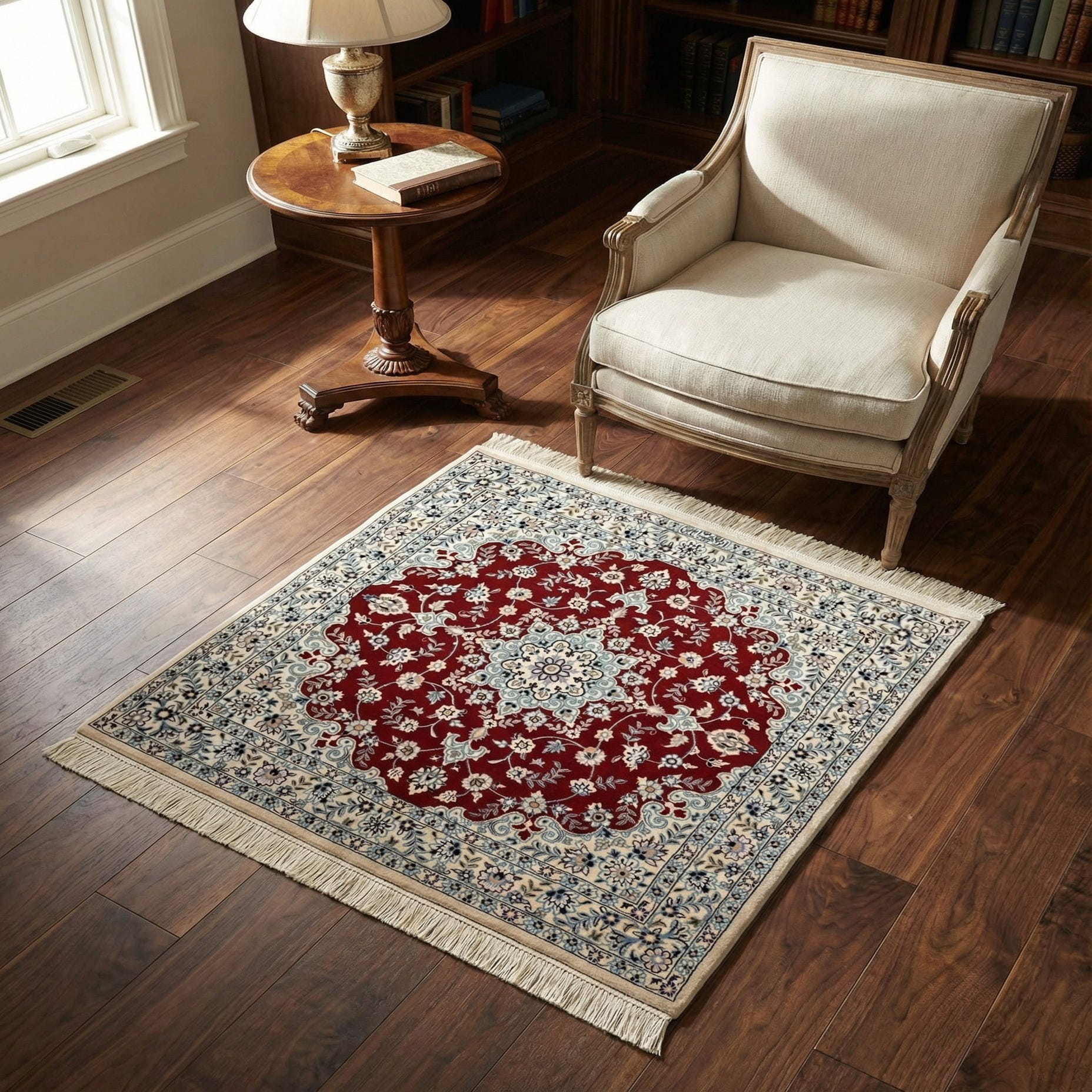 The Nain Collection offers a 3 Ft Square rug handcrafted from a blend of wool and silk, revealing a luxurious depth and texture. This piece features a rich red background adorned with intricate patterns in beige, fostering a sense of traditional elegance. The detailed border showcases an array of floral and vine motifs, adding to the ornate aesthetic of the rug.