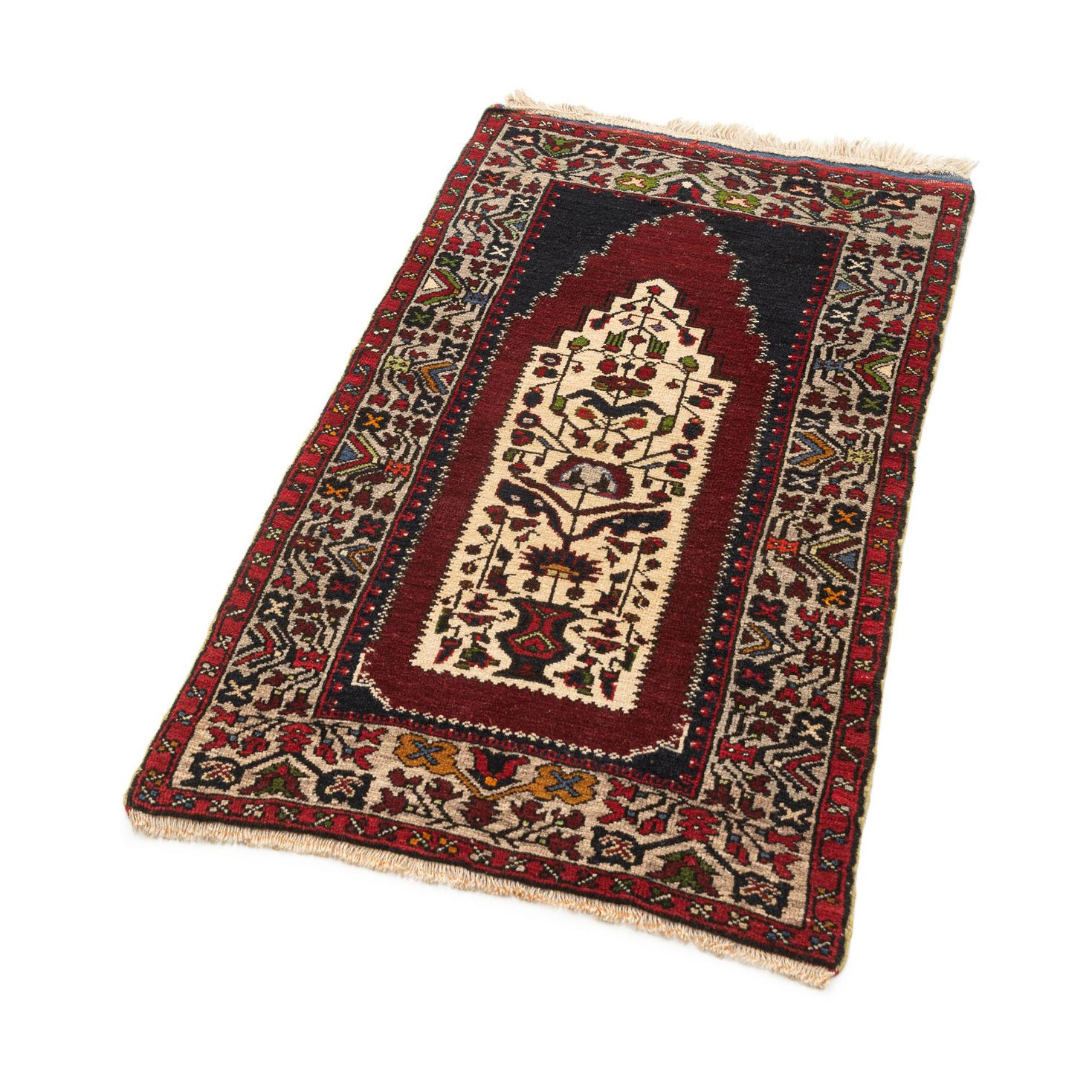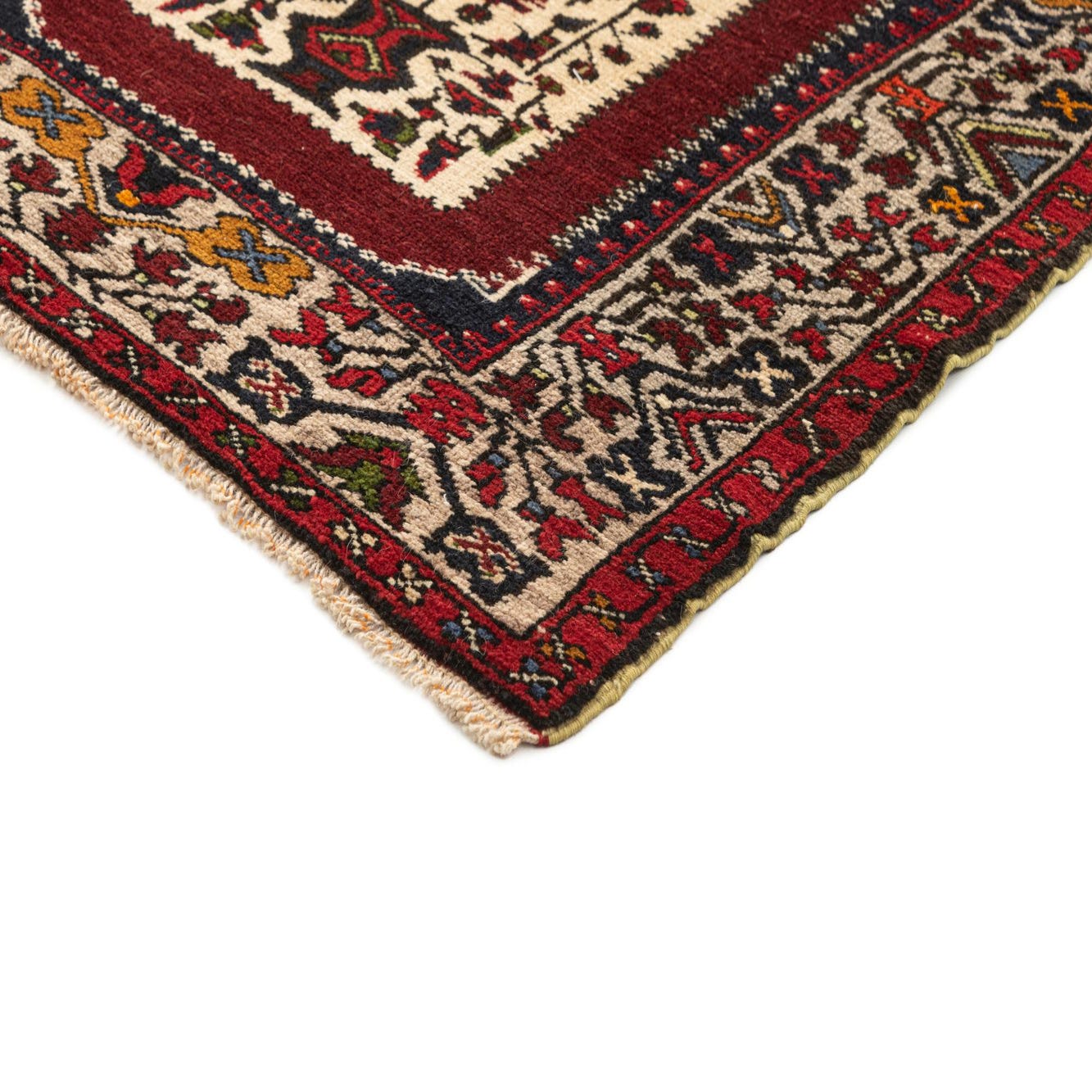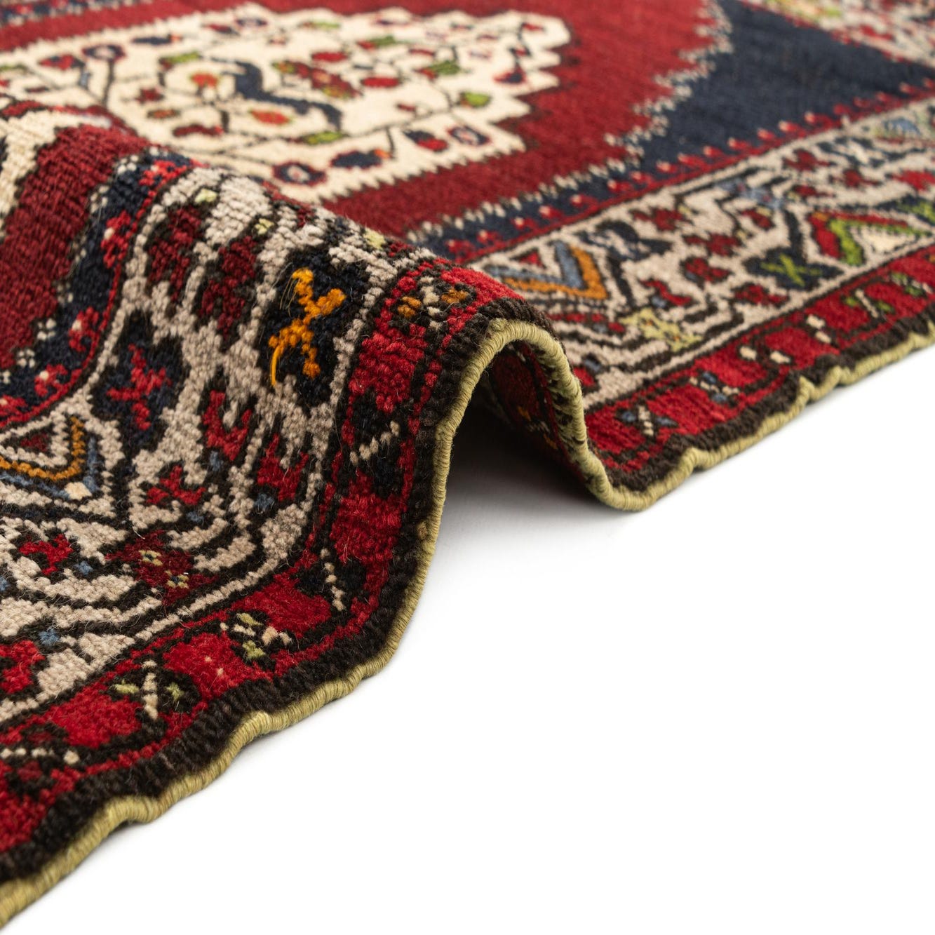 A 3x4 rectangular Anatolian wool rug featuring a central cream medallion with floral motifs against a deep red and navy background, bordered by intricate traditional patterns.