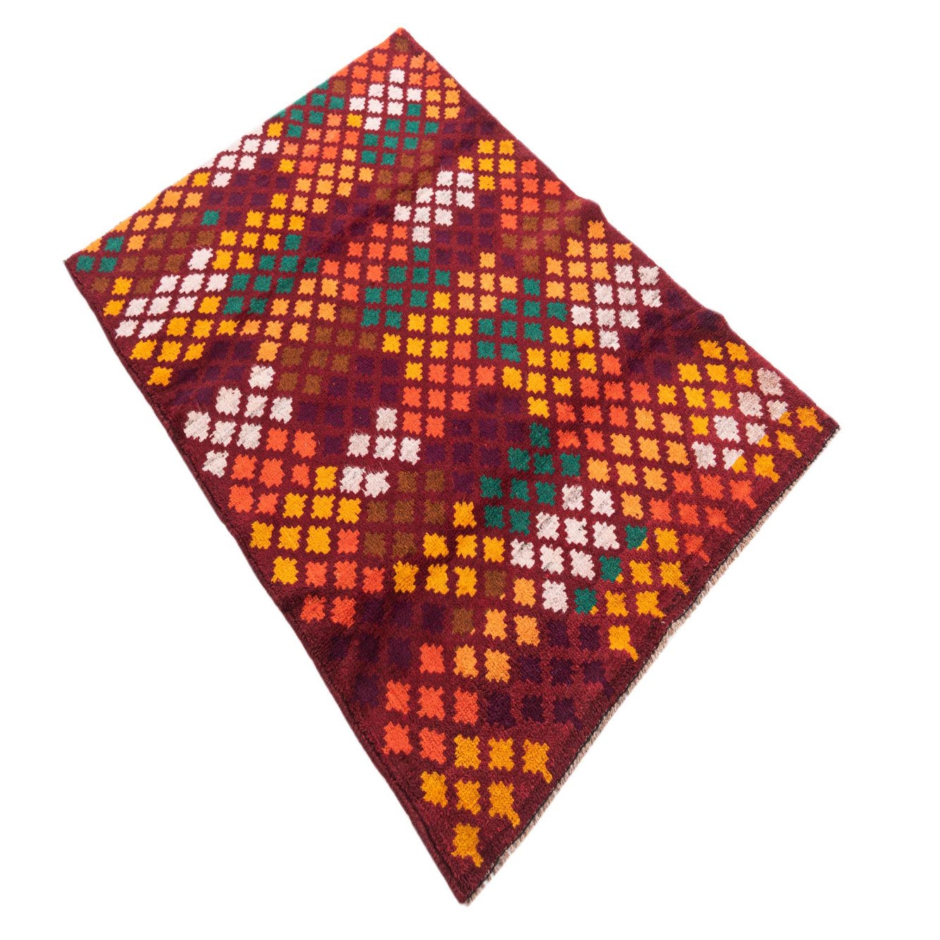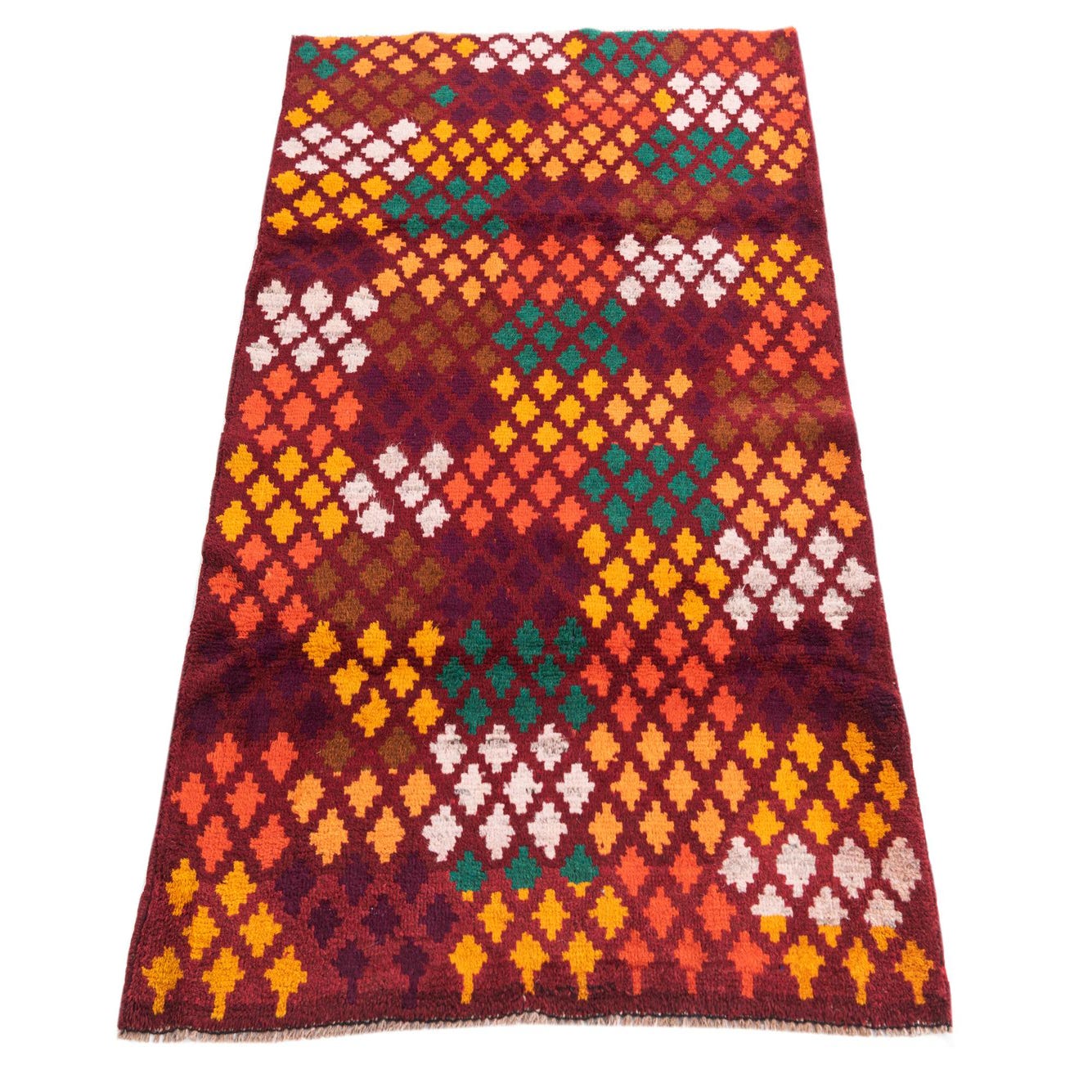 The Balouch rug's compact size allows for flexibility in placement, making it an ideal selection for entryways, home offices, or as an accent piece within larger living spaces. Its vibrant palette and resilient wool construction ensure that this piece is not only visually appealing but also suited to withstand the demands of everyday life.