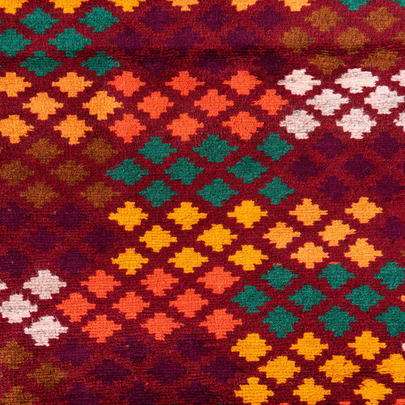 The Balouch collection presents a meticulously hand-knotted rug crafted from 100% wool, offering a durable and tactile underfoot experience. Measuring 3x4, this rug displays a harmonious pattern of geometric motifs, creating a compelling visual rhythm throughout its surface. Its red background is complemented by a bold yet balanced palette of green, maroon, orange, yellow, and pink, infusing warmth and energy into any space. The inclusion of traditional fringes adds a classic touch to the rug's edges, embracing both heritage and craftsmanship.