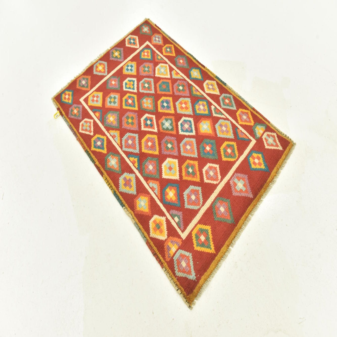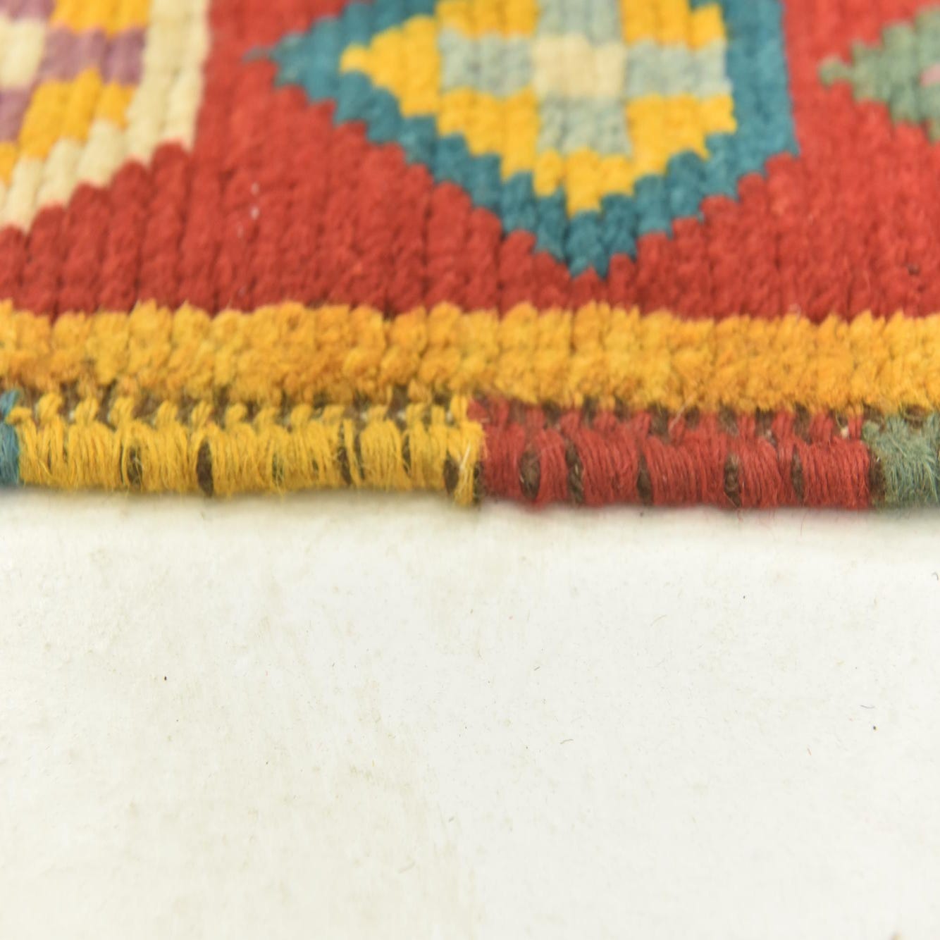 Primary color is Red. Colors in this rug include: Red, Gold, Green, Ivory, Light Blue, Yellow, Purple.