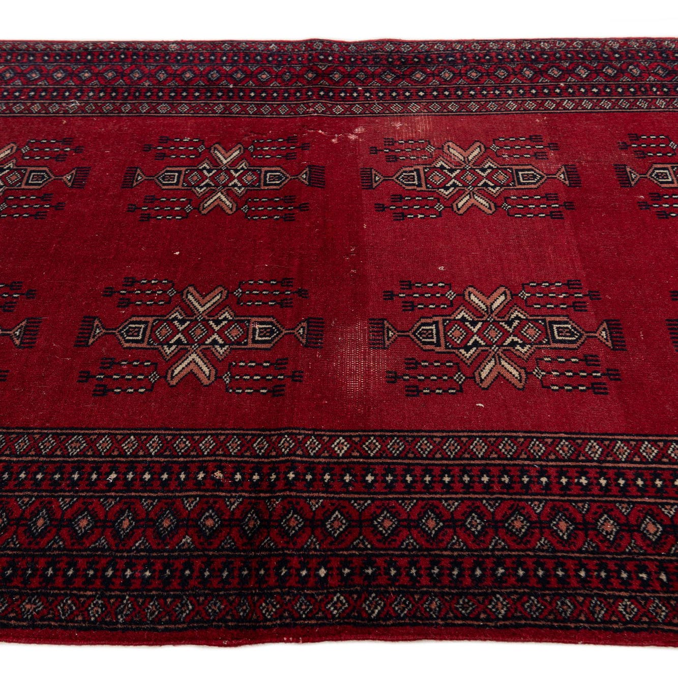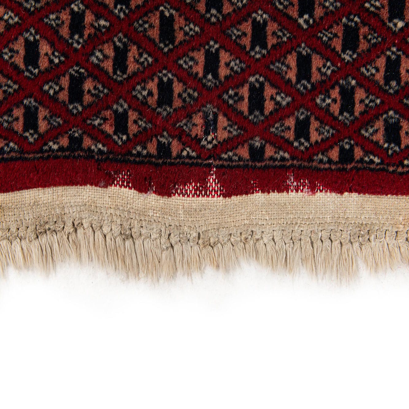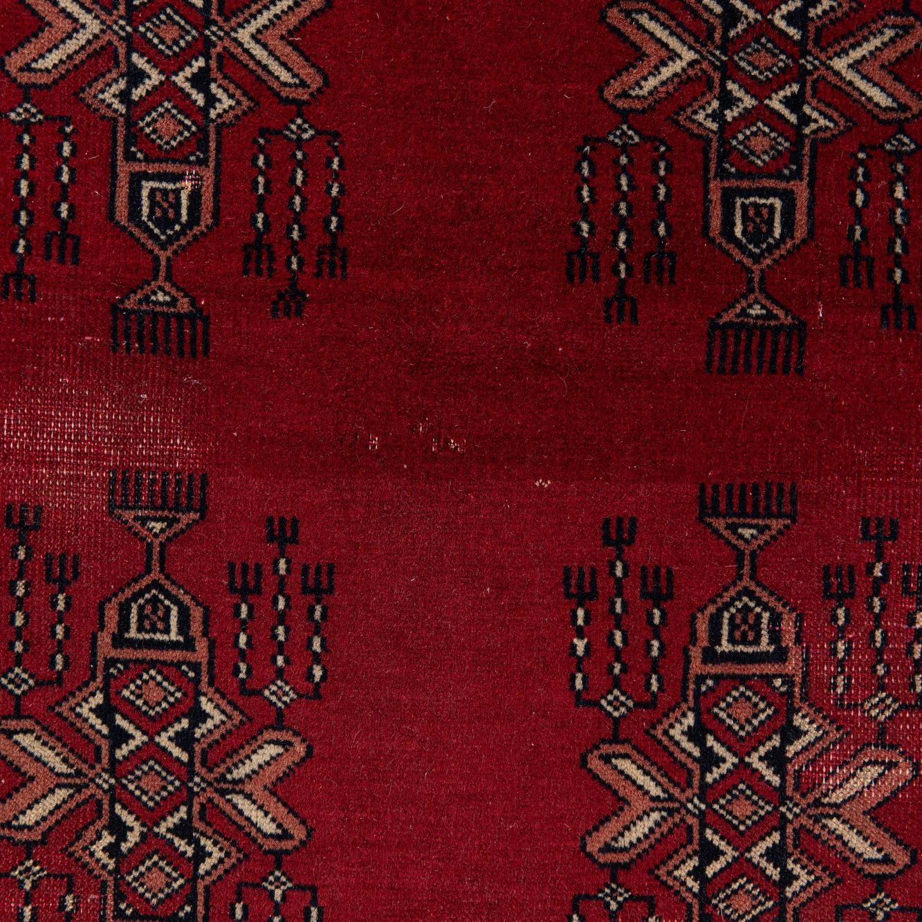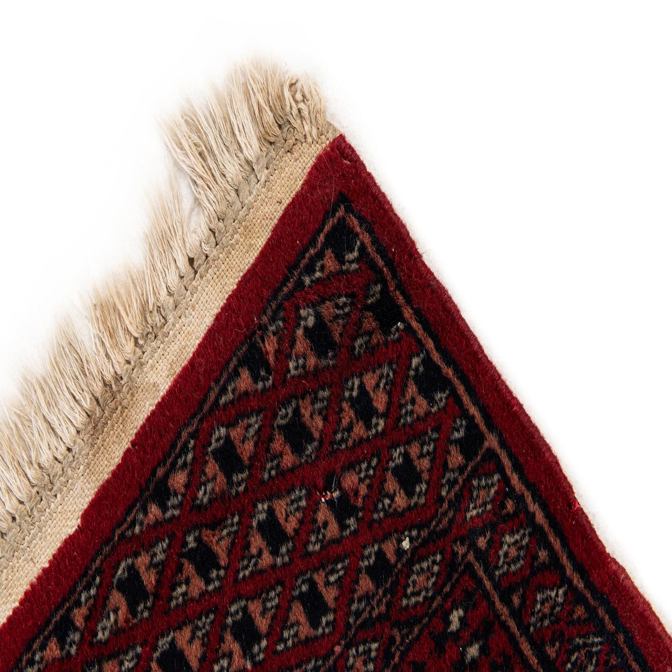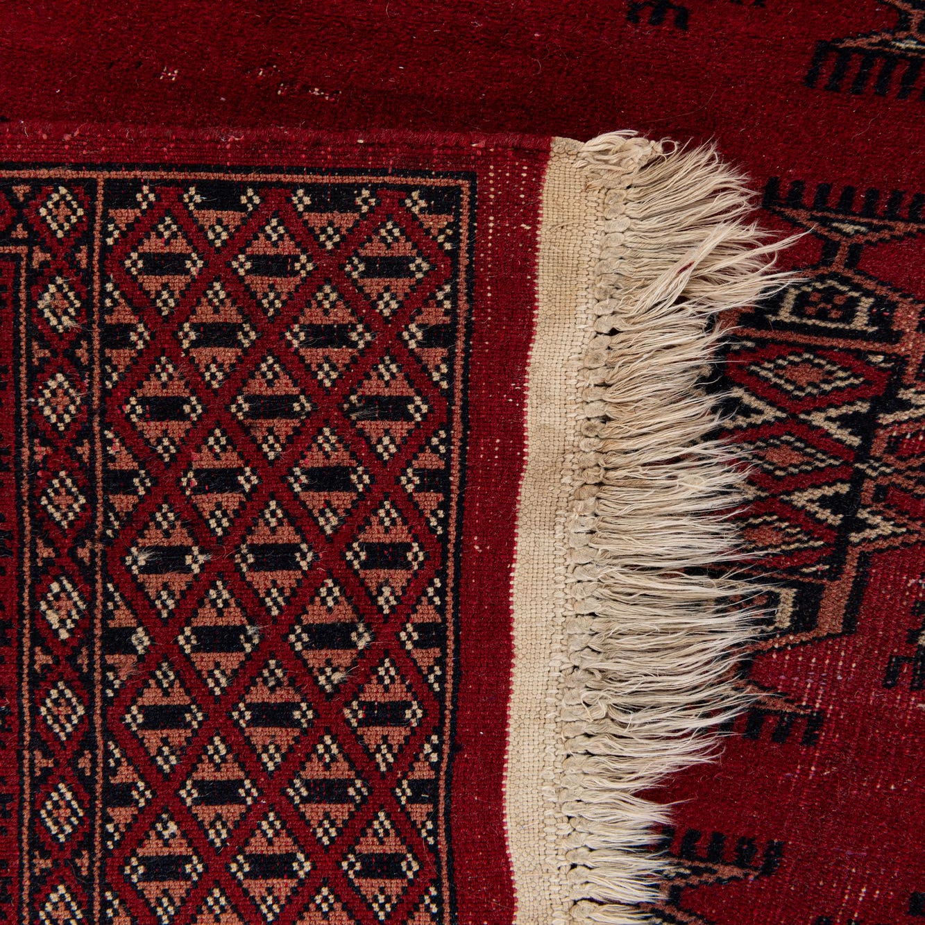 A 3x4 rectangular Bokhara rug in deep red with traditional tribal patterns and fringed edges, suitable for indoor use.