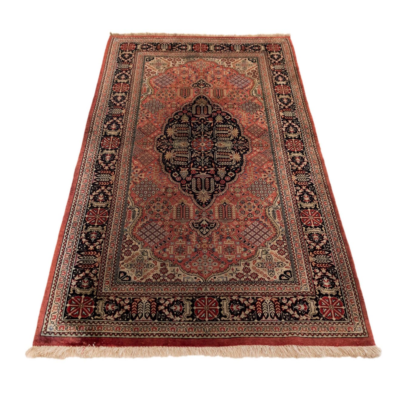 A finely detailed Persian-style medallion rug with a warm red field and an elongated central medallion in deep navy and ivory. The surface is densely knotted with intricate floral and geometric motifs—small rosettes, lattice diamonds and palmette forms—balanced by multiple guard borders that repeat floral and rosette elements in navy, ivory and touches of muted gold. Hand made of silk, the pile has a low, lustrous finish that feels smooth and cool to the touch and gives the pattern a subtle sheen that changes with light. Short silk fringe finishes the ends for a classic look.