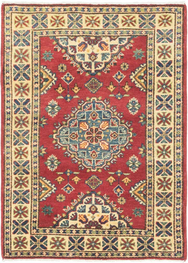 A 3x4 rectangular red Kazak rug with a central blue and cream medallion and intricate traditional patterns.