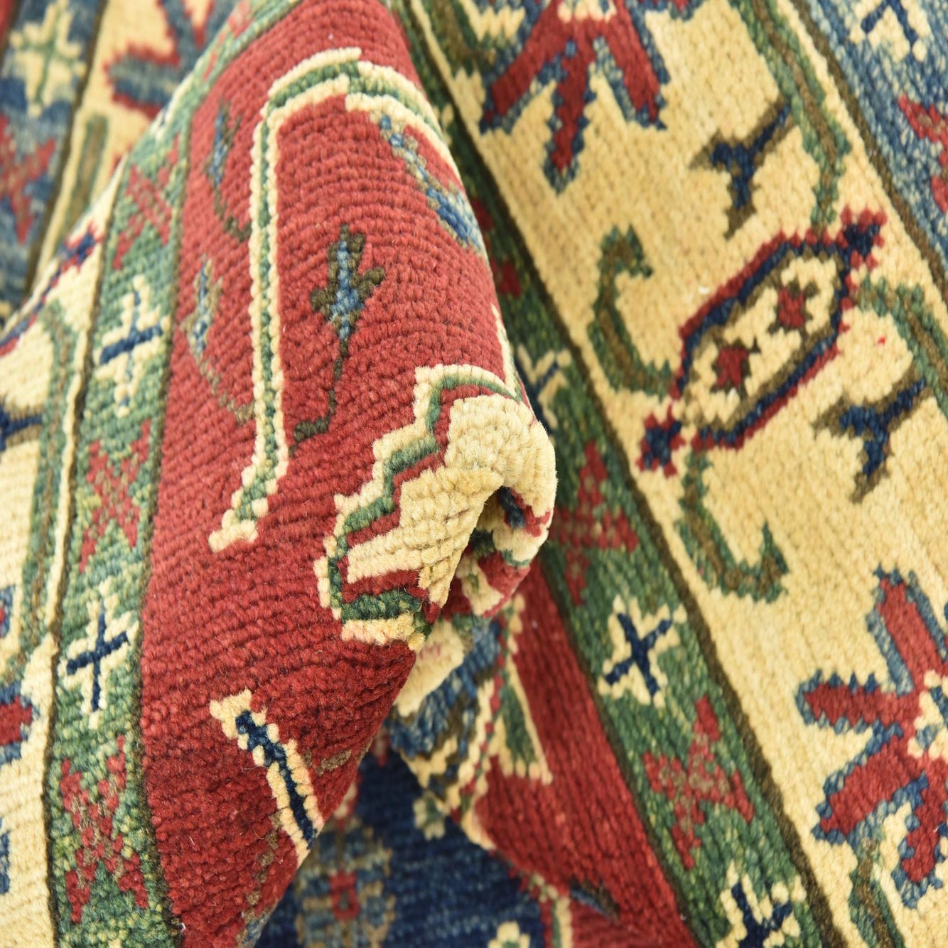 The Kazak collection boasts a meticulously hand-knotted rug measuring 3x4 feet, crafted from 100% hand-spun wool. This piece presents a rich red background accented by a harmonious blend of colors including blue, brown, cream, green, and navy blue, creating a vibrant yet balanced visual tapestry. The rug features traditional geometrical and tribal motifs that are synonymous with Kazak designs, offering both visual interest and a sense of time-honored craftsmanship. The texture of the hand-spun wool provides a tangible sense of quality and authenticity.
