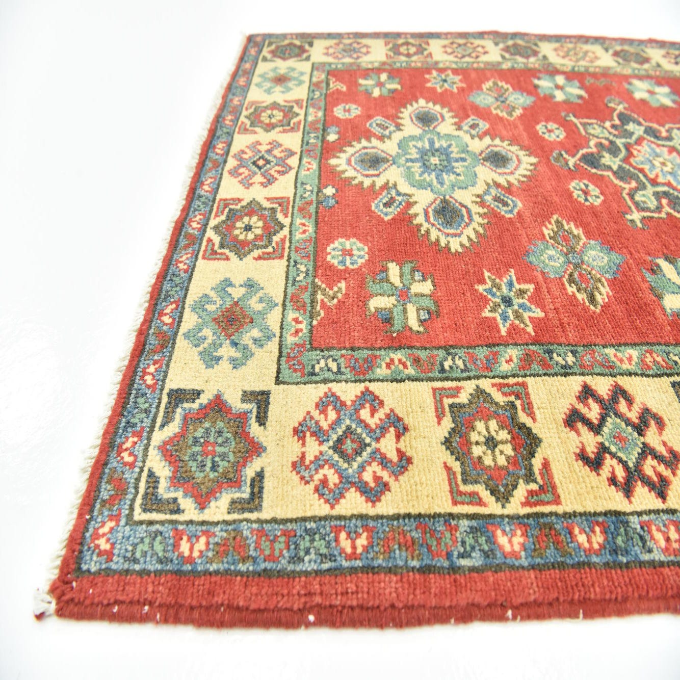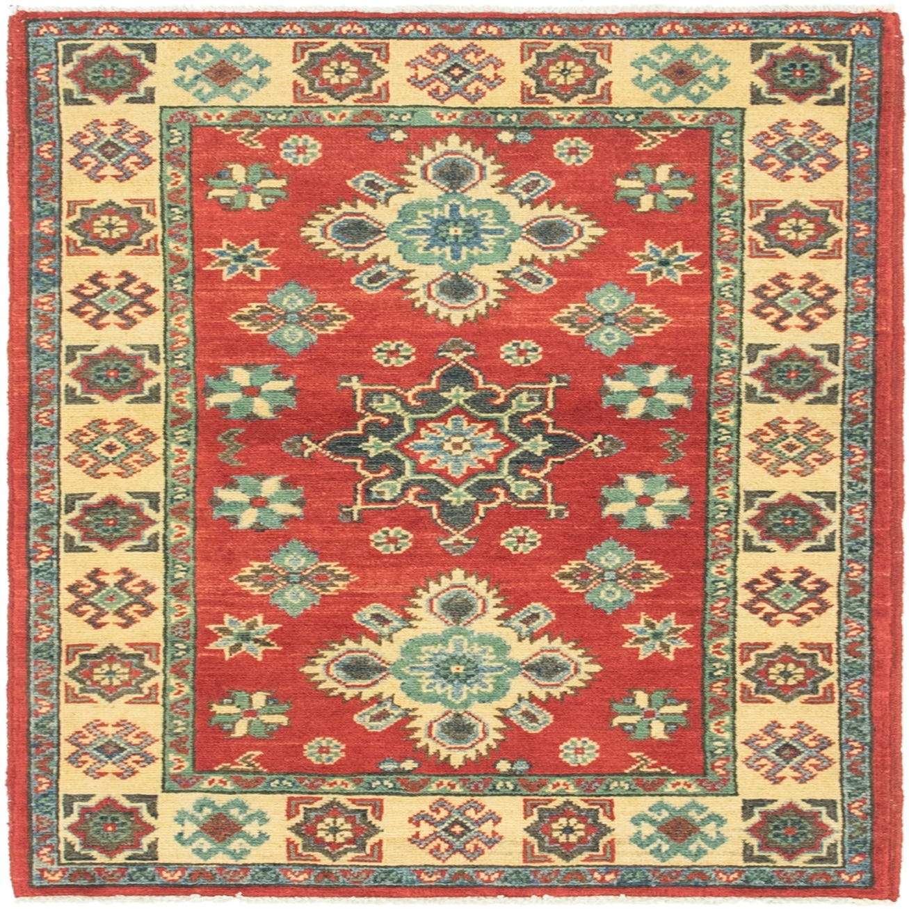 A 3x4 rectangular Rugs.com Kazak rug with a red field, featuring a central medallion and tribal patterns in blue, green, and cream.