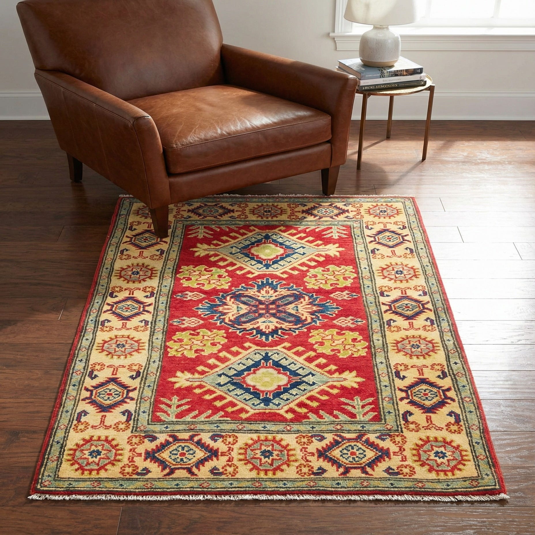 This Kazak collection rug is hand-knotted from 100% hand-spun wool, offering a durable construction with a substantial feel underfoot. Its dimensions are 3 feet by 4 feet, making it versatile for a variety of spaces. The piece features a rich red background, which is complemented by a traditional array of accent colors including brown, cream, light blue, light green, and navy blue.