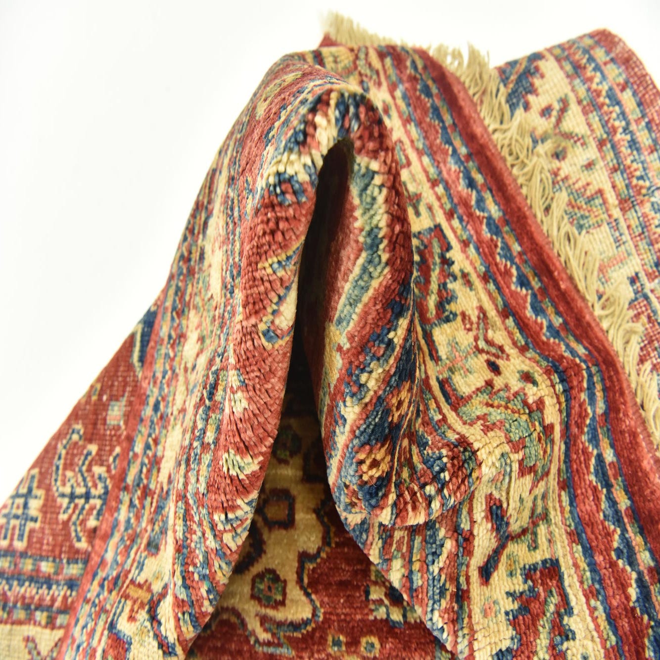 The Kazak Collection offers a meticulously hand-knotted rug crafted from 100% hand-spun wool, presenting a durable yet soft texture that is pleasing underfoot. This 3x4 piece features a rich red background color, complemented by an array of intricate patterns and motifs in shades of blue, brown, gold, green, and cream. The detailed geometry and symmetrical designs are characteristic of the Kazak style, which draws inspiration from traditional Caucasian rugs known for their bold and vibrant designs.