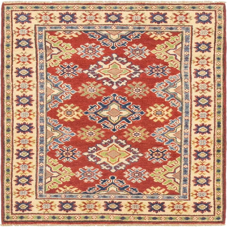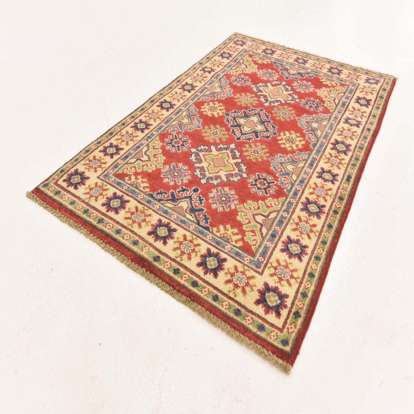A 3x4 rectangular Rugs.com Kazak rug with a red field and a cream border, featuring traditional tribal patterns in blue, green, and gold.