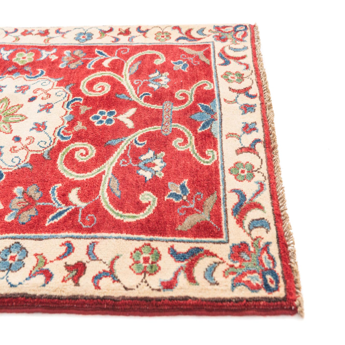 The Kazak collection 3x4 rug is a testament to the rich tradition of hand-knotted craftsmanship. Woven from 100% hand spun wool, this durable piece features a bold red background complemented by a variety of accent hues including blue, brown, gold, green, and navy blue. The intricate patterns boast geometric and botanical motifs, creating a visually striking centerpiece for any room.