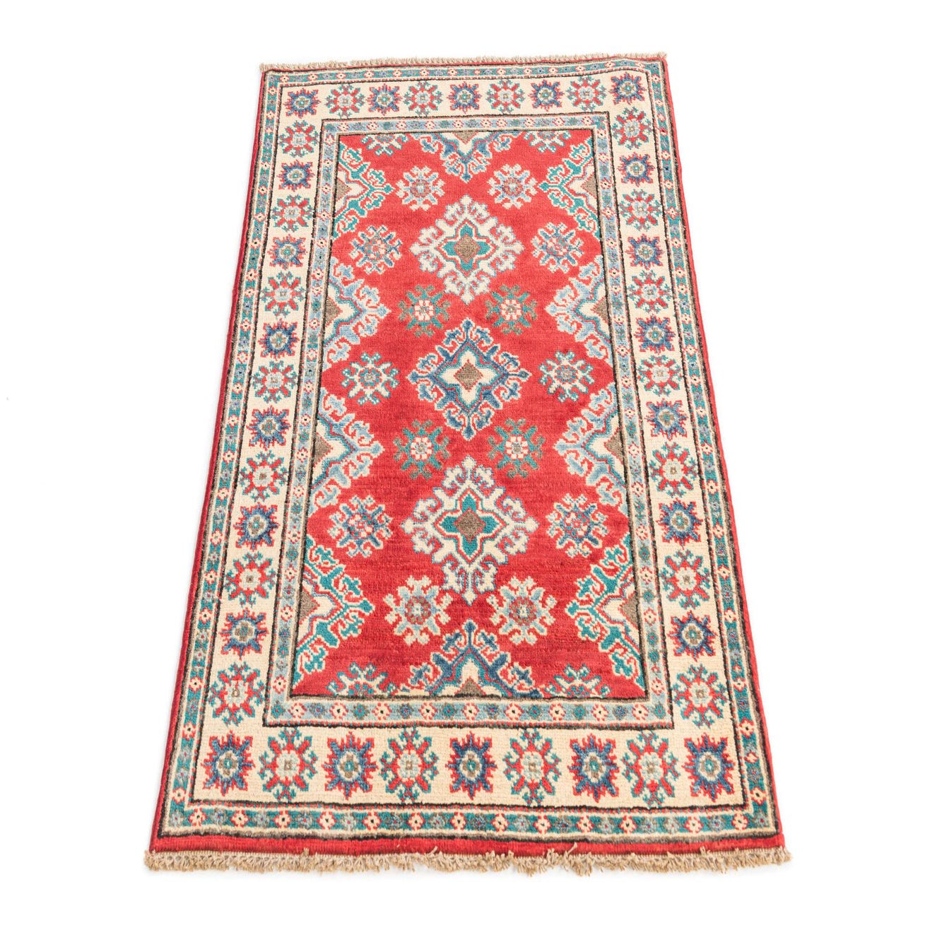 A 3x4 rectangular Rugs.com Kazak rug with a vibrant red field, featuring traditional Southwestern and Oriental patterns in blue, teal, and cream, framed by a cream border with floral motifs.