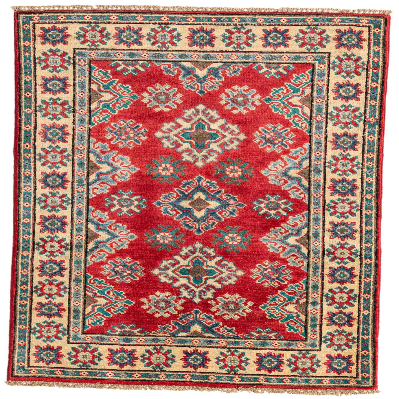 This Kazak collection rug, measuring 3x4, is meticulously hand-knotted from 100% hand-spun wool, offering both durability and tactile appeal. The rug showcases a rich red background, providing a vibrant canvas for the traditional geometric motifs that adorn it. The pattern incorporates a harmonious blend of blue, brown, cream, gold, and green hues, creating a bold yet balanced visual impact. An intricate border frames the central design, featuring complementary colors that enhance the overall aesthetic.