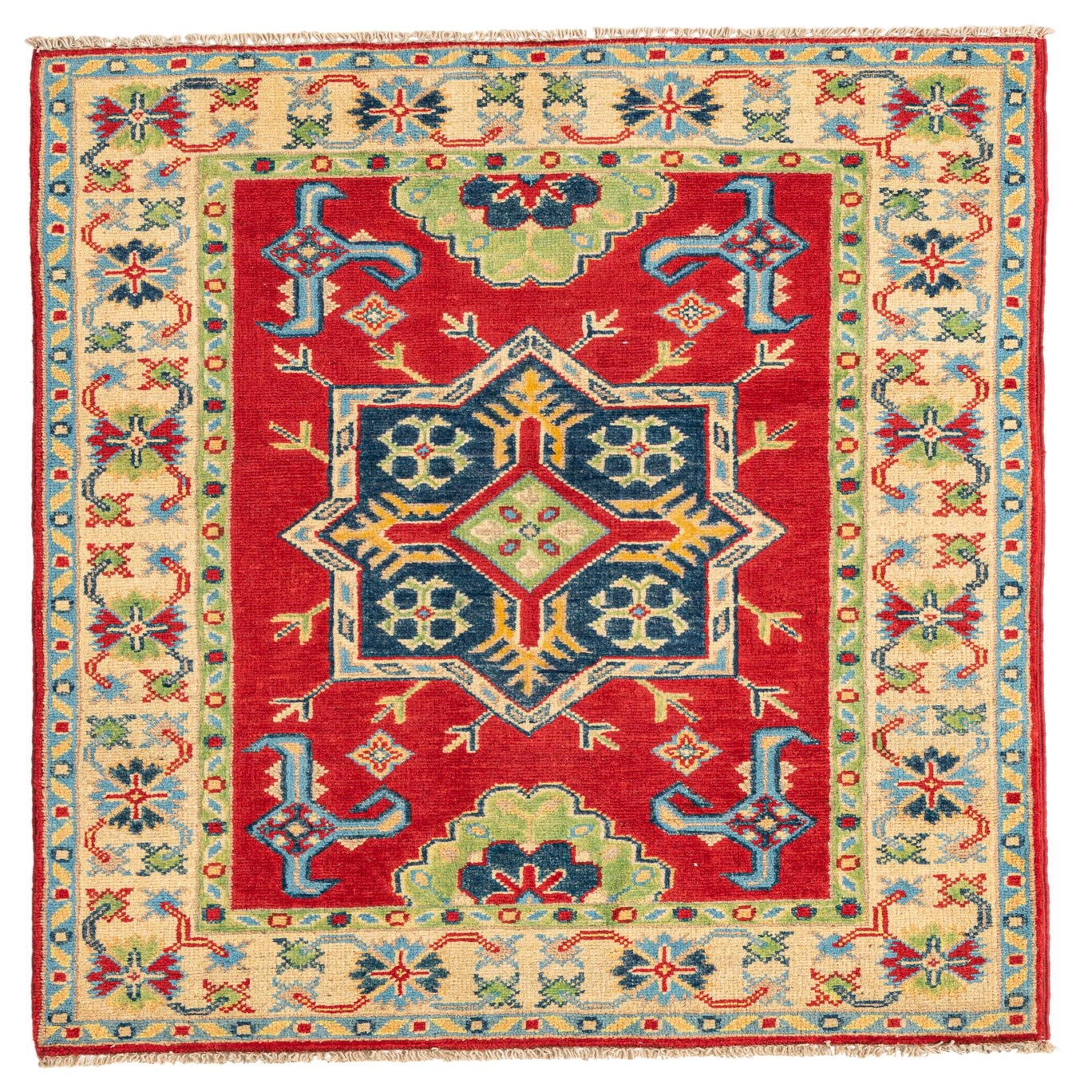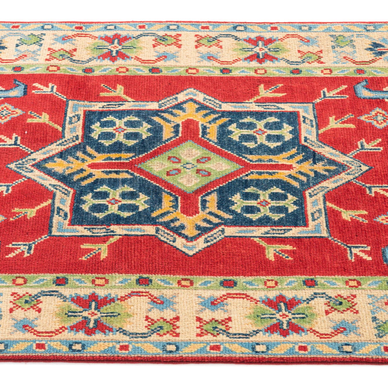The Kazak Collection rug is a hand-knotted piece crafted from 100% hand-spun wool, measuring 3x4 feet. Rich in tradition, this rug features a bold red background complemented by intricate patterns in shades of blue, brown, gold, green, and navy blue. Its detailed geometric and stylized floral motifs are typical of the Kazak designs, offering both symmetry and cultural authenticity.