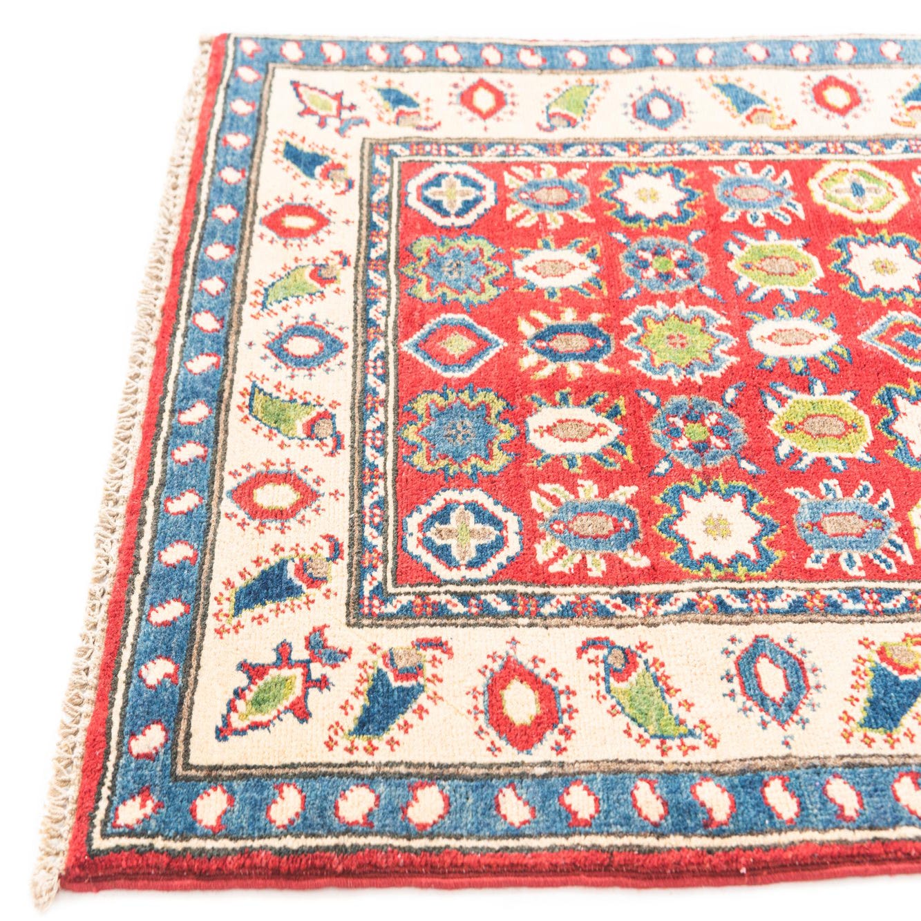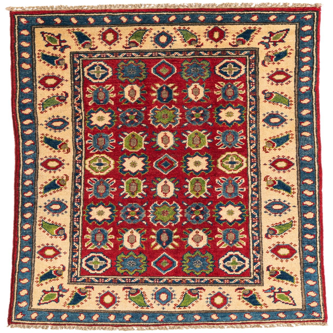 This Kazak collection rug presents a timeless aesthetic with its rich red background and a harmonious composition of geometric shapes and traditional motifs. Hand-knotted from 100% hand-spun wool, this 3x4 rug exhibits a robust medley of colors including red, blue, brown, cream, navy blue, and green which enhance the intricate design elements.