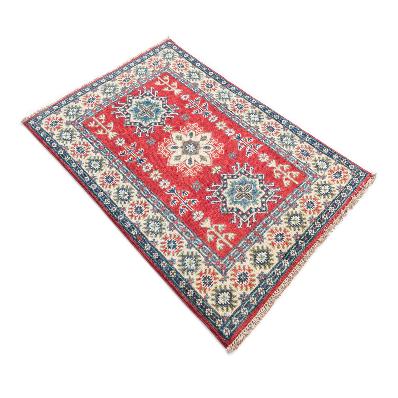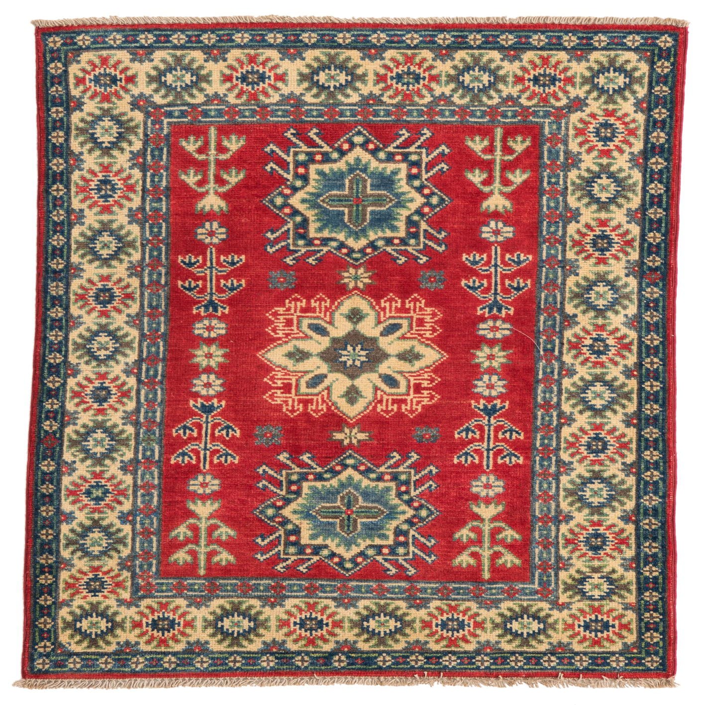 This Kazak collection rug is a hand-knotted masterpiece crafted from 100% hand-spun wool, measuring 3x4 feet, which offers a luxuriously tactile experience underfoot. The rug exhibits a vibrant red background providing a rich canvas for the traditional geometric patterns that draw inspiration from centuries-old designs. Hues of blue, brown, cream, and green are intricately woven into the rug, creating a visually striking contrast that highlights the meticulous craftsmanship.