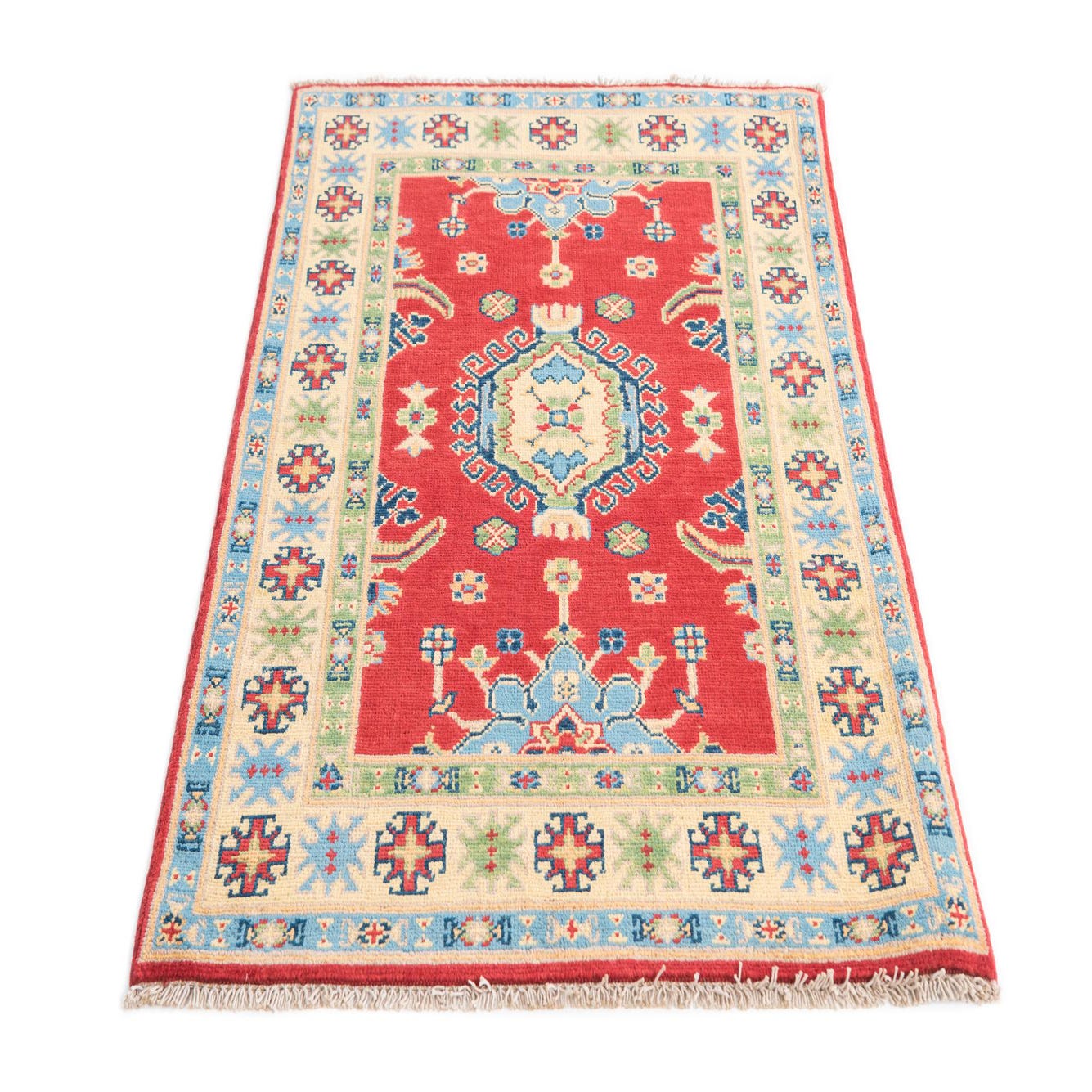 This Kazak collection rug is a hand-knotted piece crafted from 100% hand-spun wool, boasting a durable and textured feel. Measuring 3x4, the rug features a prominent red background embellished with an array of traditional motifs. The striking geometric pattern is detailed with hues of blue, brown, cream, green, and navy blue, creating a rich visual palette that is both timeless and engaging.