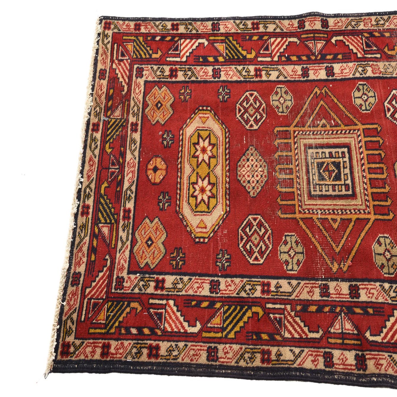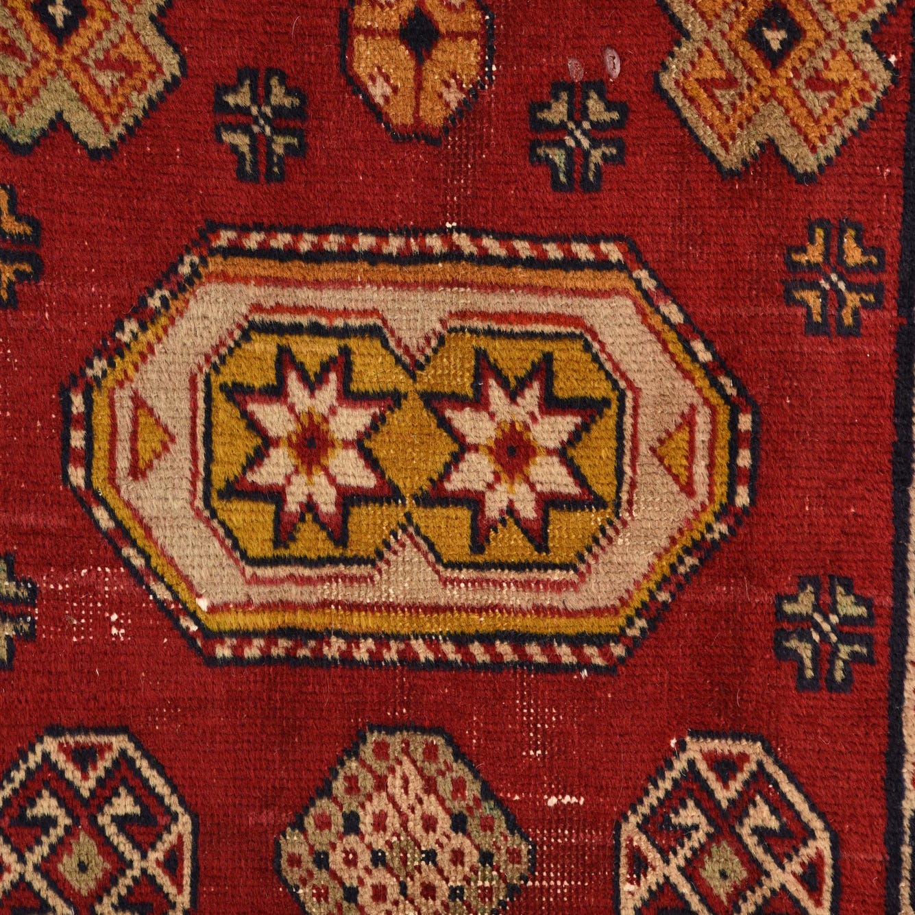 Primary color is Red. Colors in this rug include: Red, Black, Gold, Ivory.