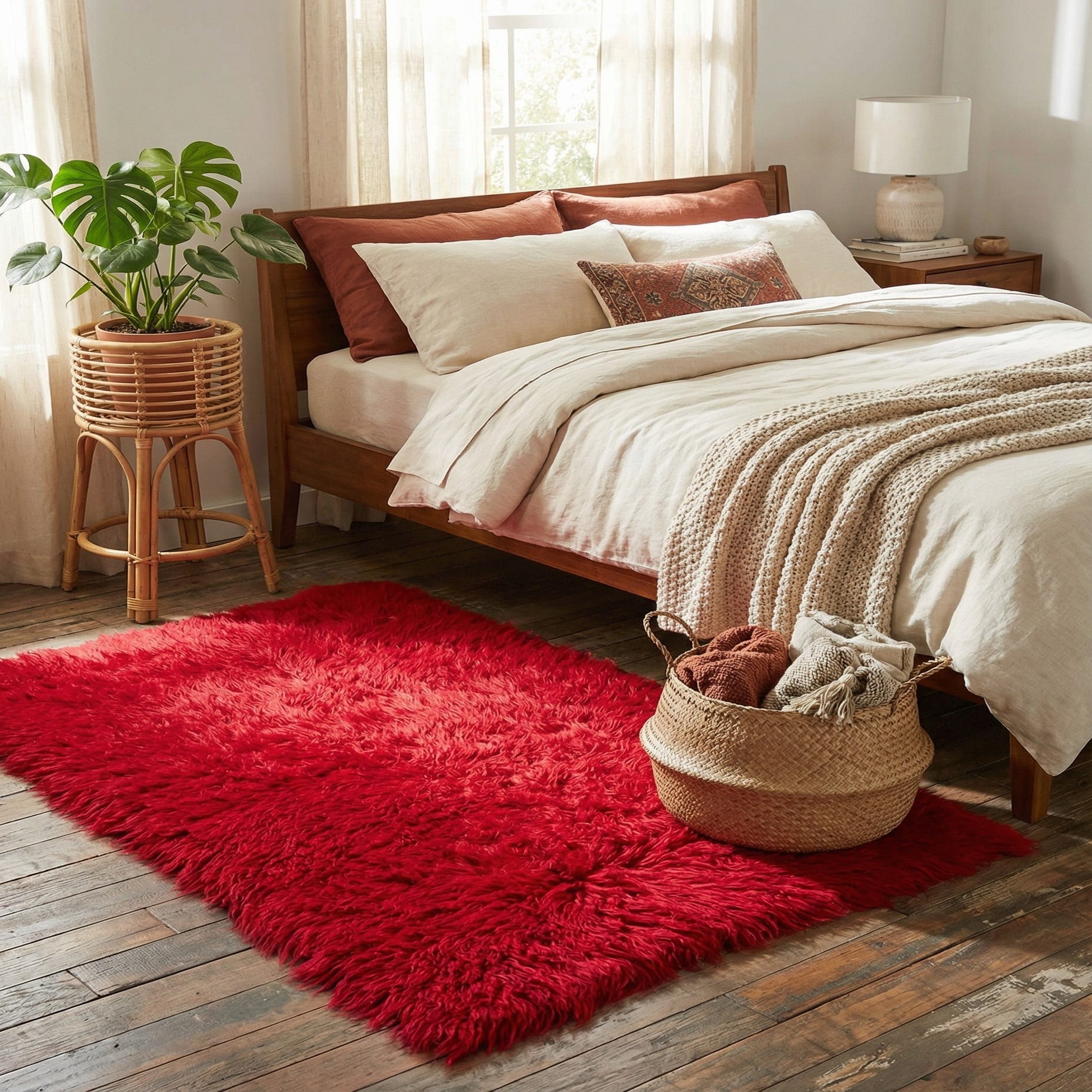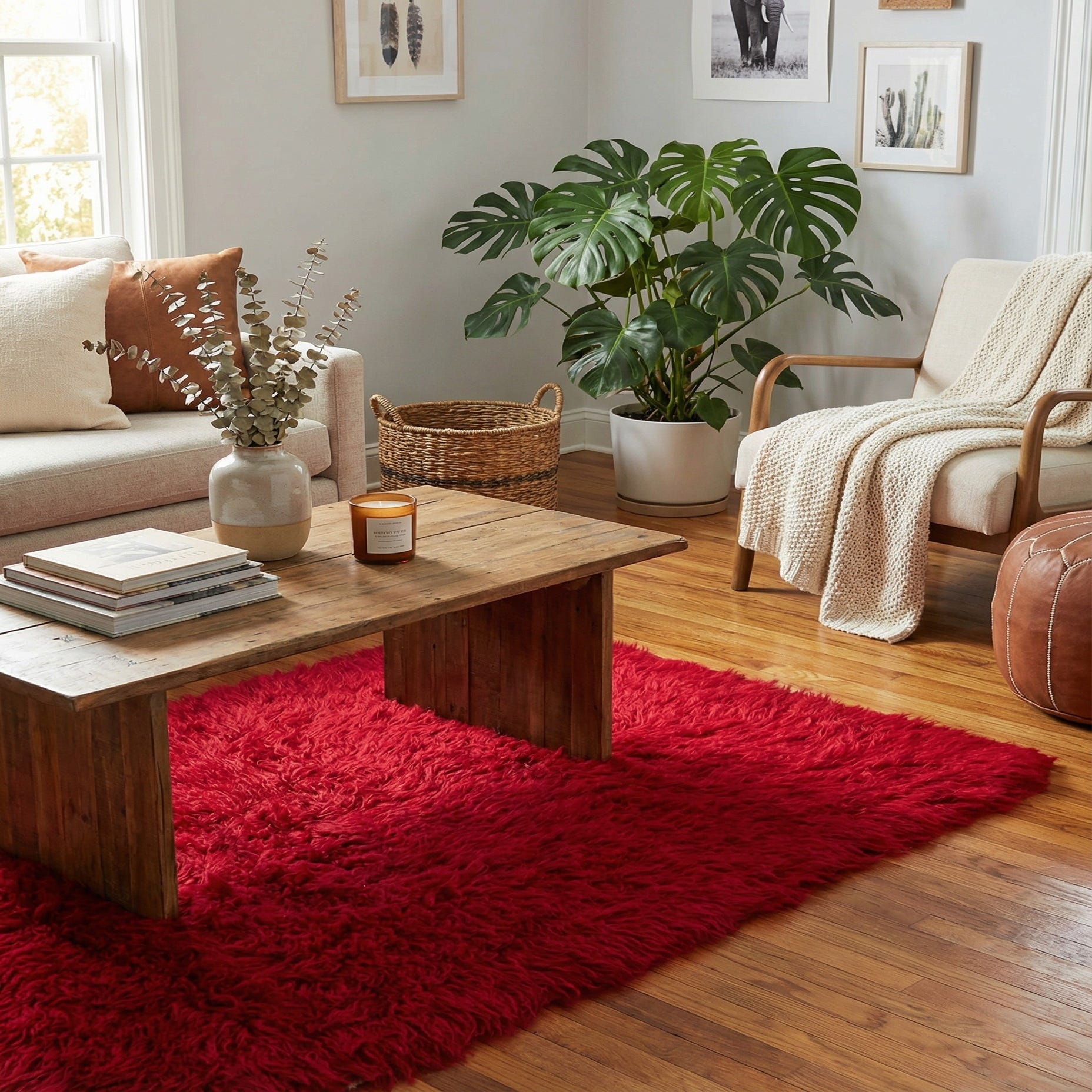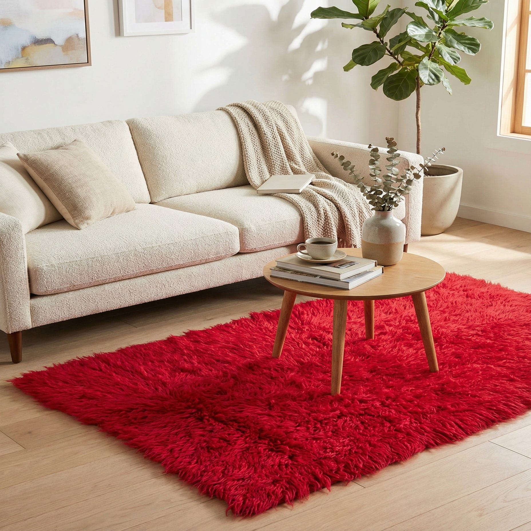 A vibrant 3x4 rectangular red shag rug with a plush, soft texture, suitable for adding warmth to any indoor space.