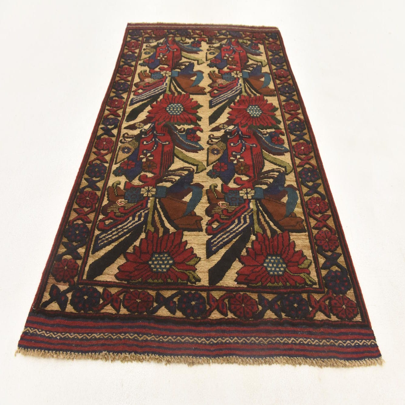 A 3x4 rectangular Sumak rug with a traditional botanical and tribal pattern in reds, blues, greens, and browns on a cream background, featuring large floral motifs and intricate borders.