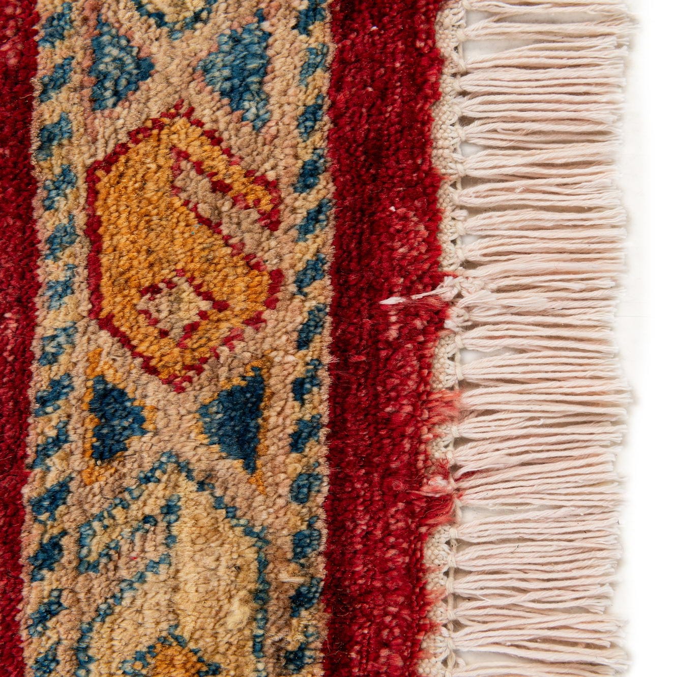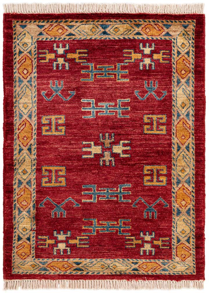 Primary color is Red. Colors in this rug include: Red, Beige, Blue, Brown, Yellow, Green.