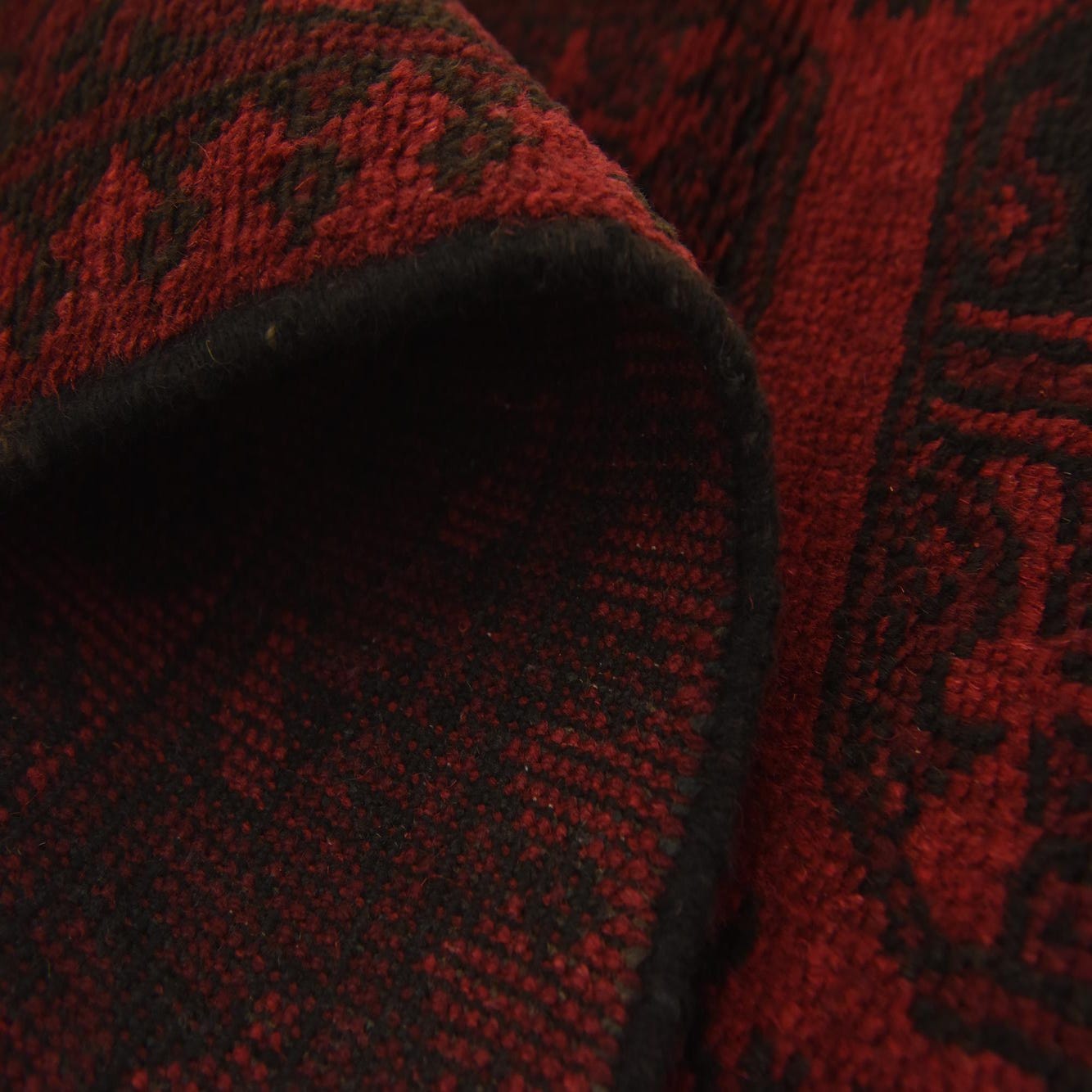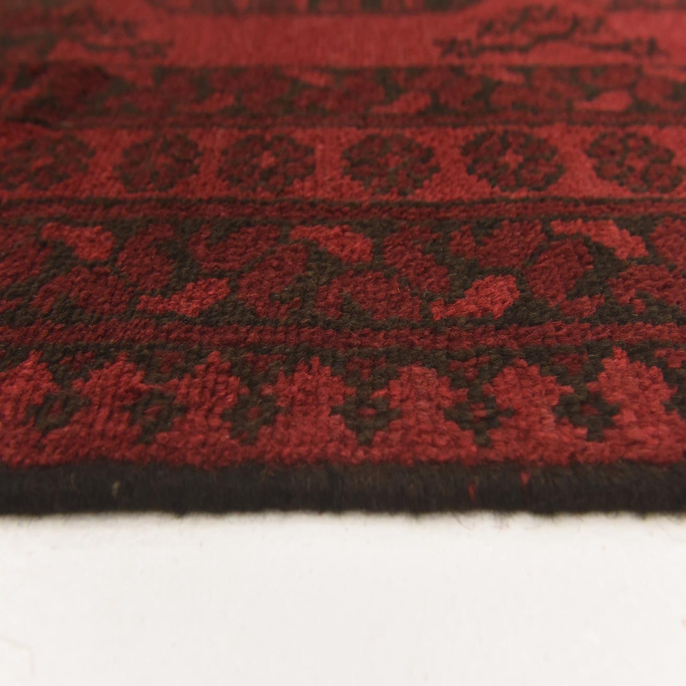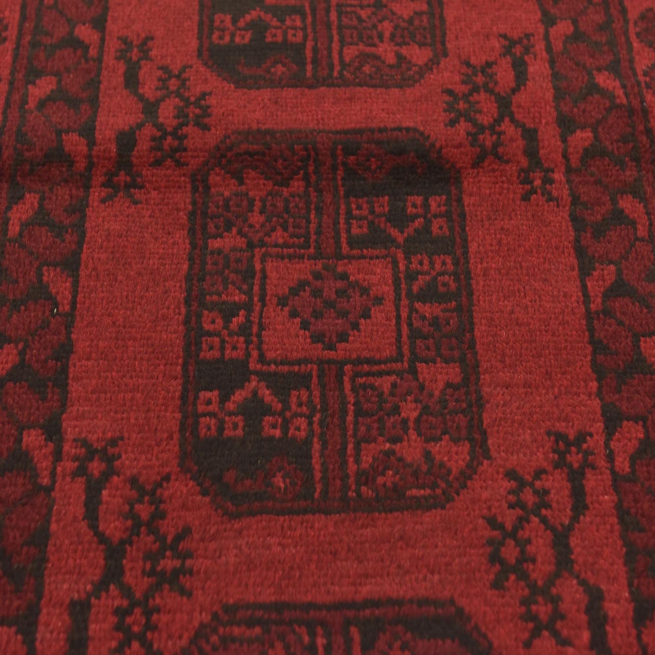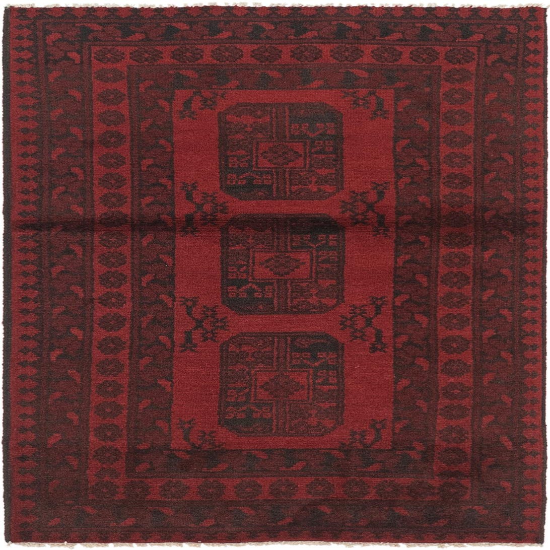 A 3x5 rectangular Afghan Akhche rug in deep red with dark tribal medallions and a traditional border.