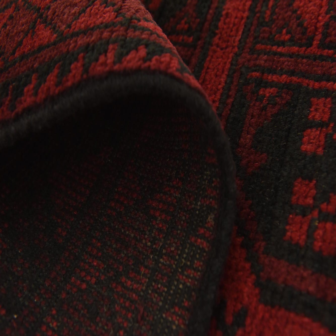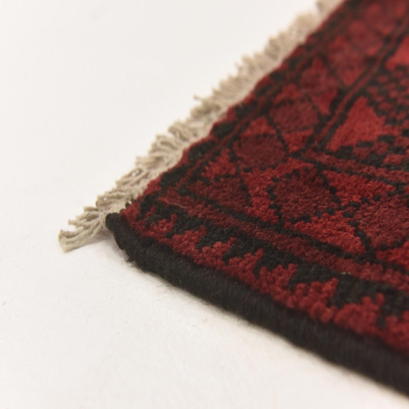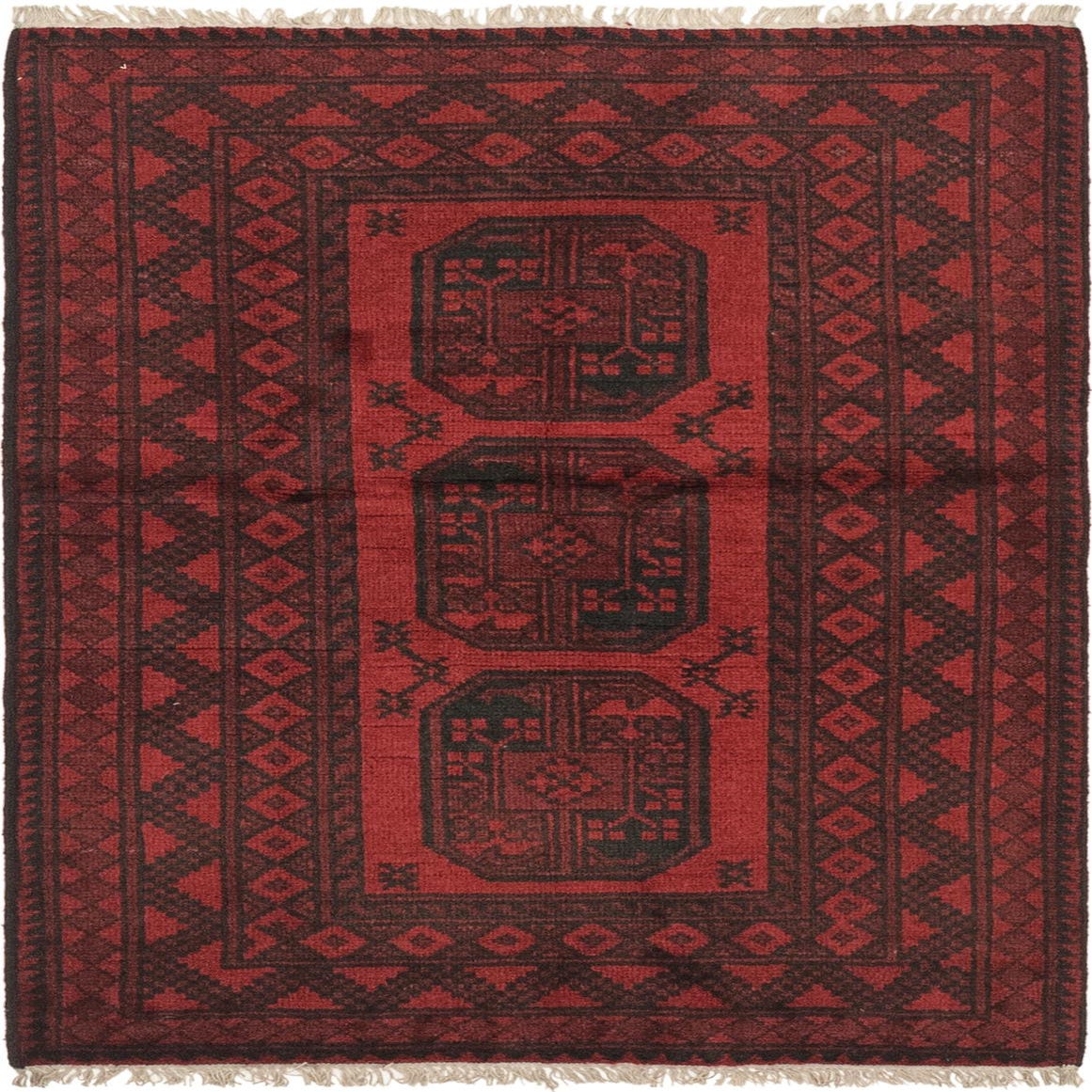 A 3x5 rectangular Afghan Akhche rug in deep red with black traditional tribal medallion patterns and a thin pile.
