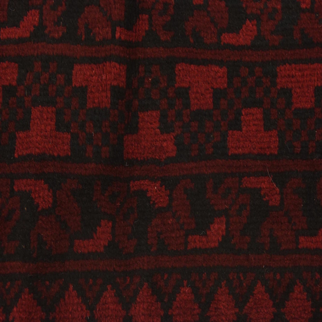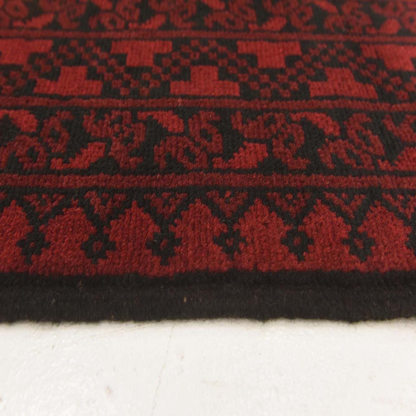A 3x5 rectangular Afghan Akhche rug in deep red with a black traditional tribal medallion pattern.