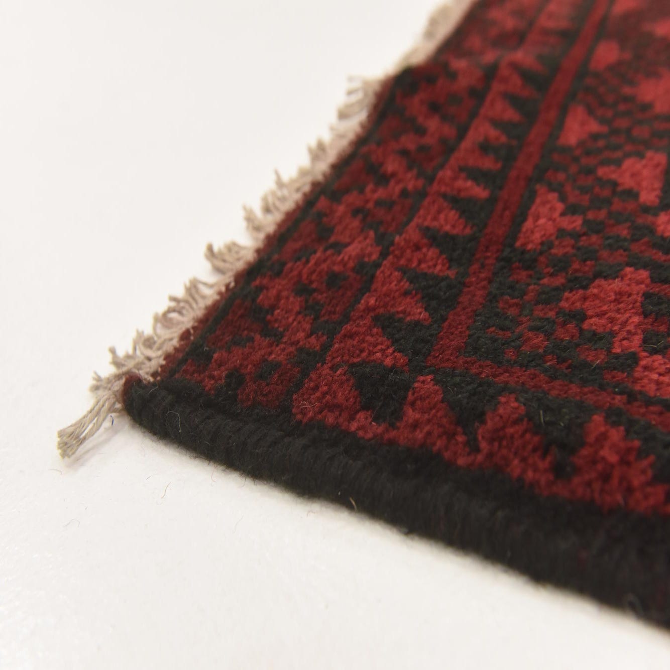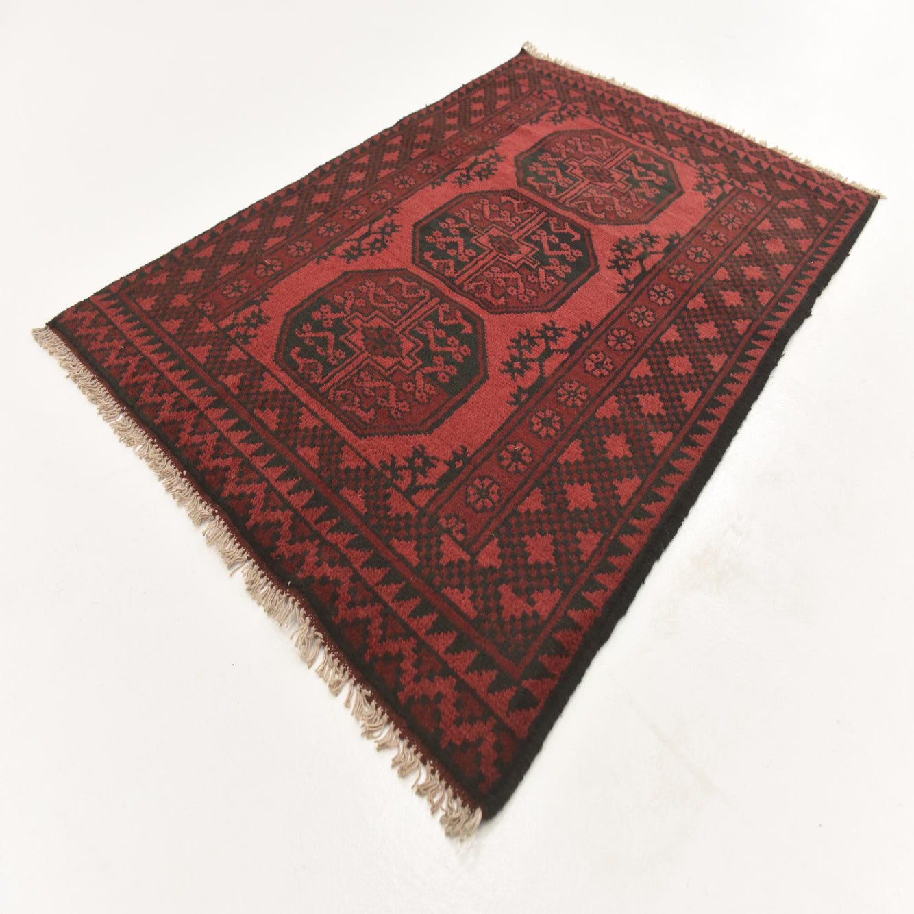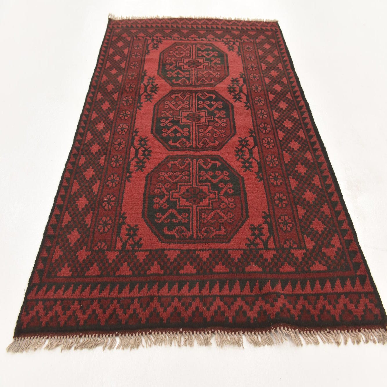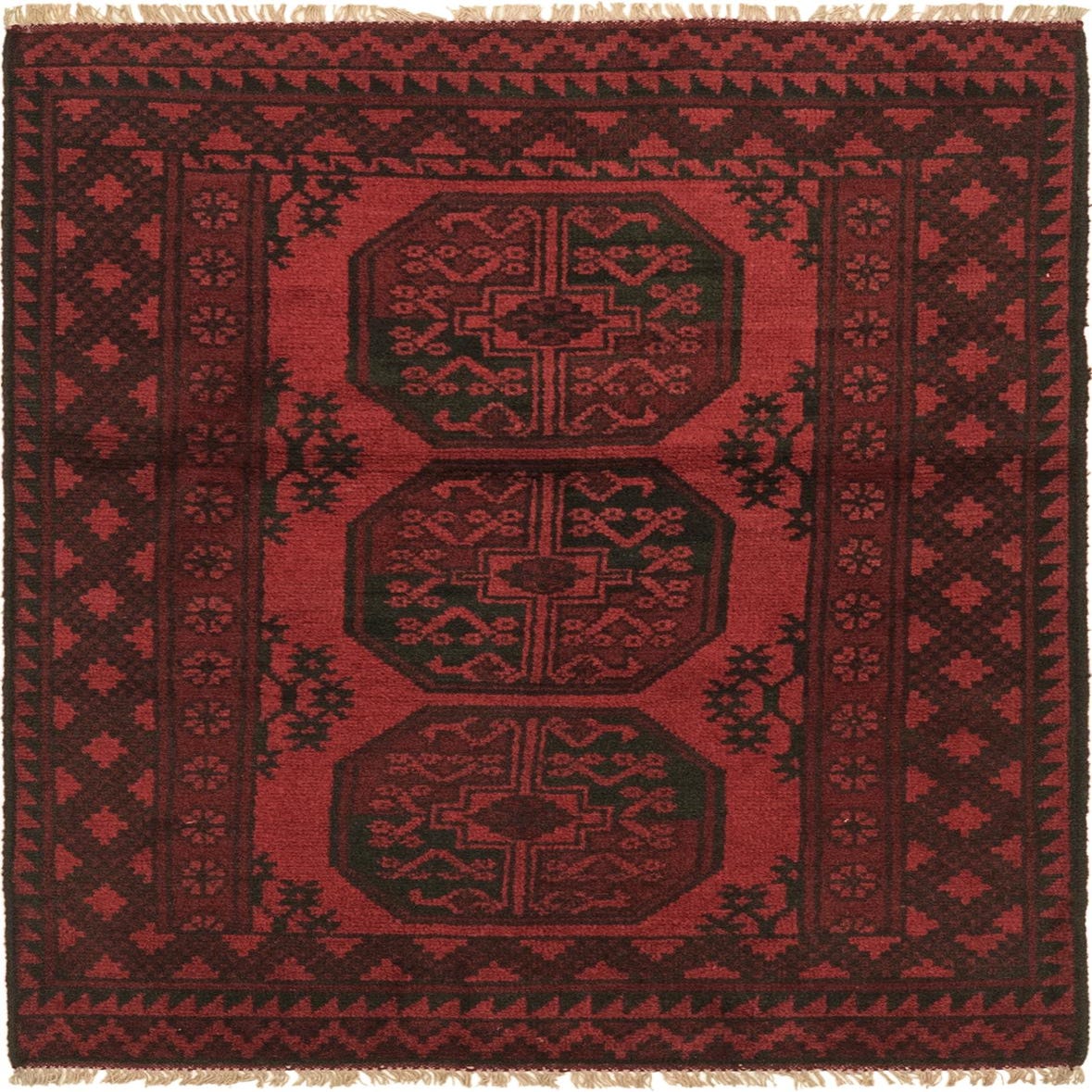 A 3x5 rectangular Afghan Akhche rug in deep reds with a traditional tribal medallion pattern and fringe.