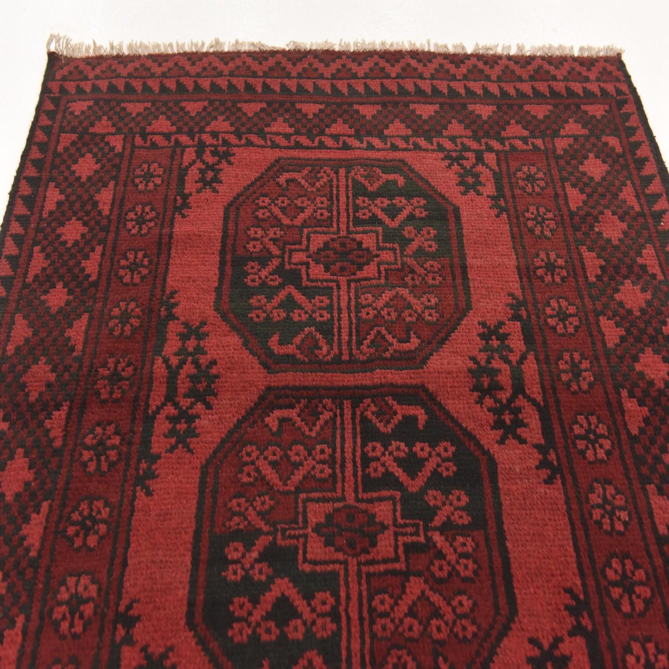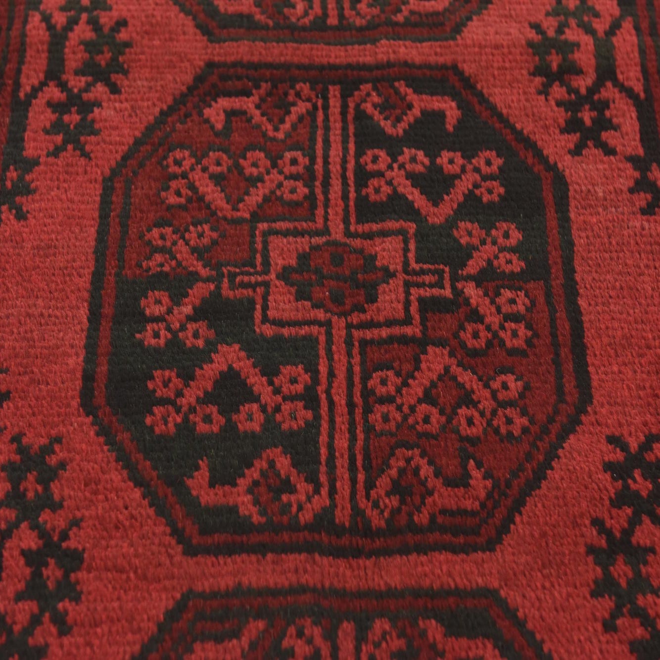 Hand-knotted in 100% wool, this rug presents a traditional Afghan layout with a central column of three octagonal medallions set against a warm red field. Intricate geometric motifs fill each medallion and repeat through multiple guard borders, where small rosette and diamond patterns create a tightly composed frame. Deep burgundy outlines and navy-blue accents provide contrast against the red background, and the short fringe at the ends completes the hand-finished look. The pile is low and densely knotted, offering a firm, tactile surface with the natural warmth and slight sheen of wool beneath your fingertips.