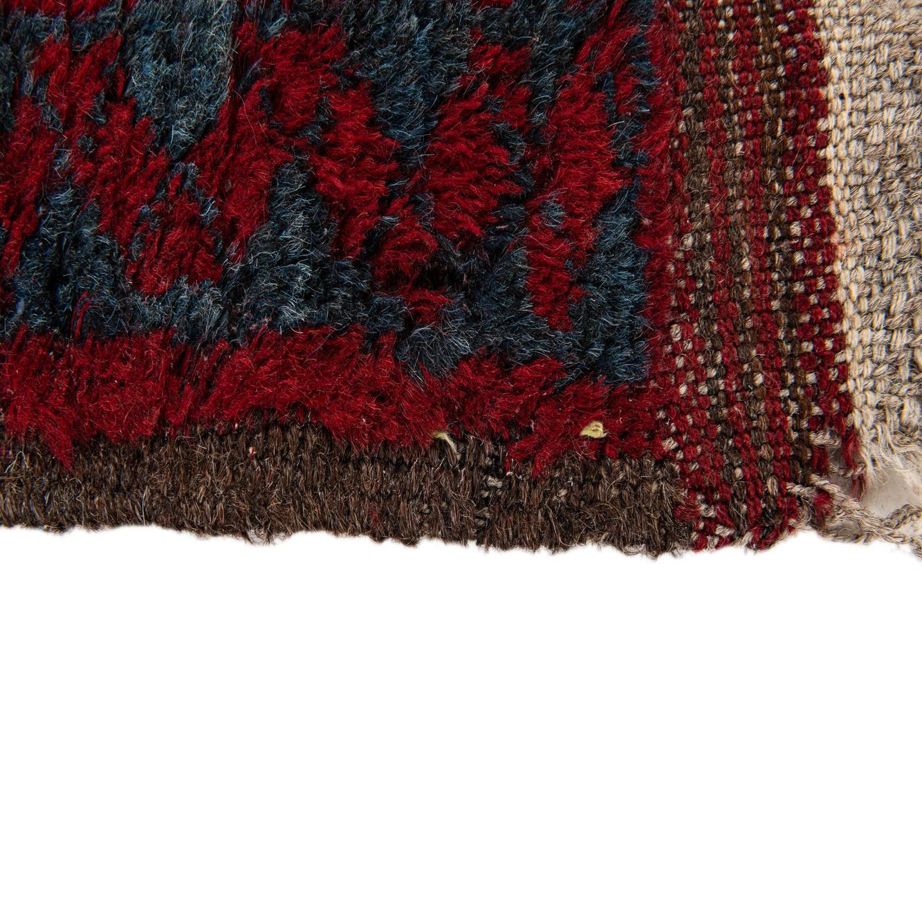 Primary color is Red. Colors in this rug include: Red, Navy Blue.