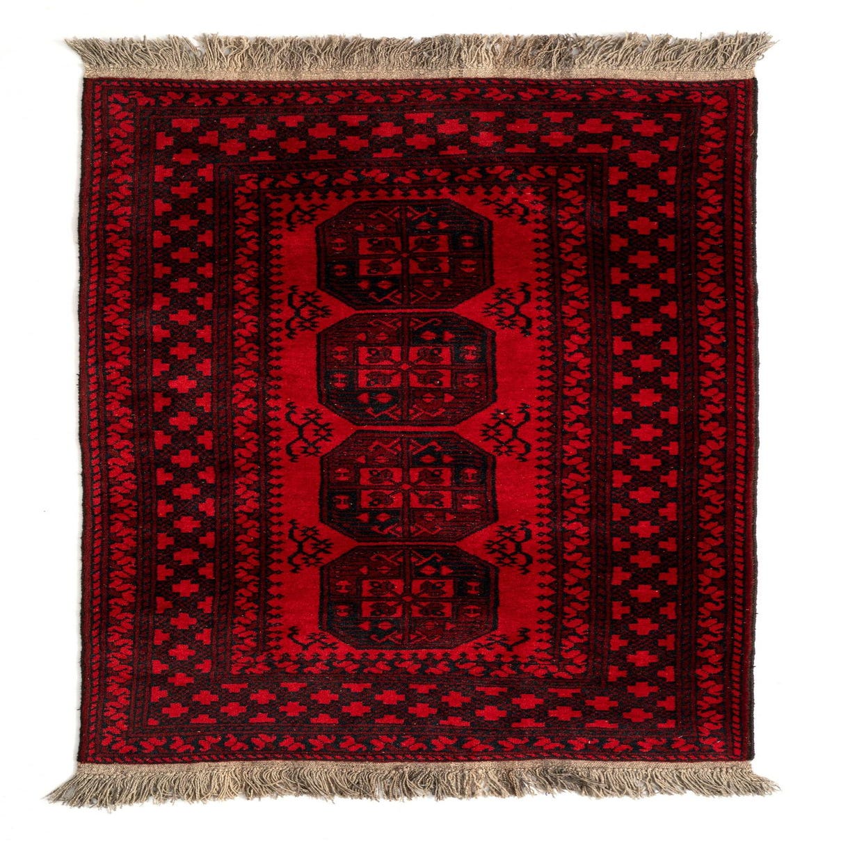 A rich red field anchors a row of bold octagonal guls worked in deep black, each filled with compact geometric motifs that read with clear symmetry. Multiple inner and outer borders carry stepped cross-like elements and small vine motifs, giving the design a structured, tribal character. Hand made of 100% wool, the rug has a dense, low pile that feels firm underfoot with a slight nap, and the natural wool fringe at both ends adds a tactile finish.