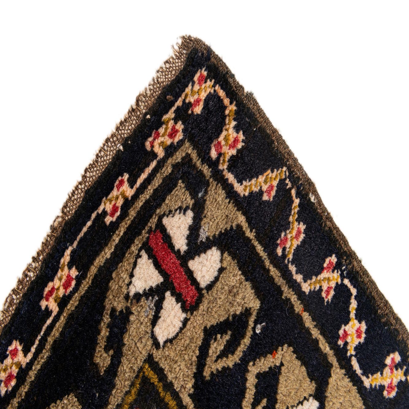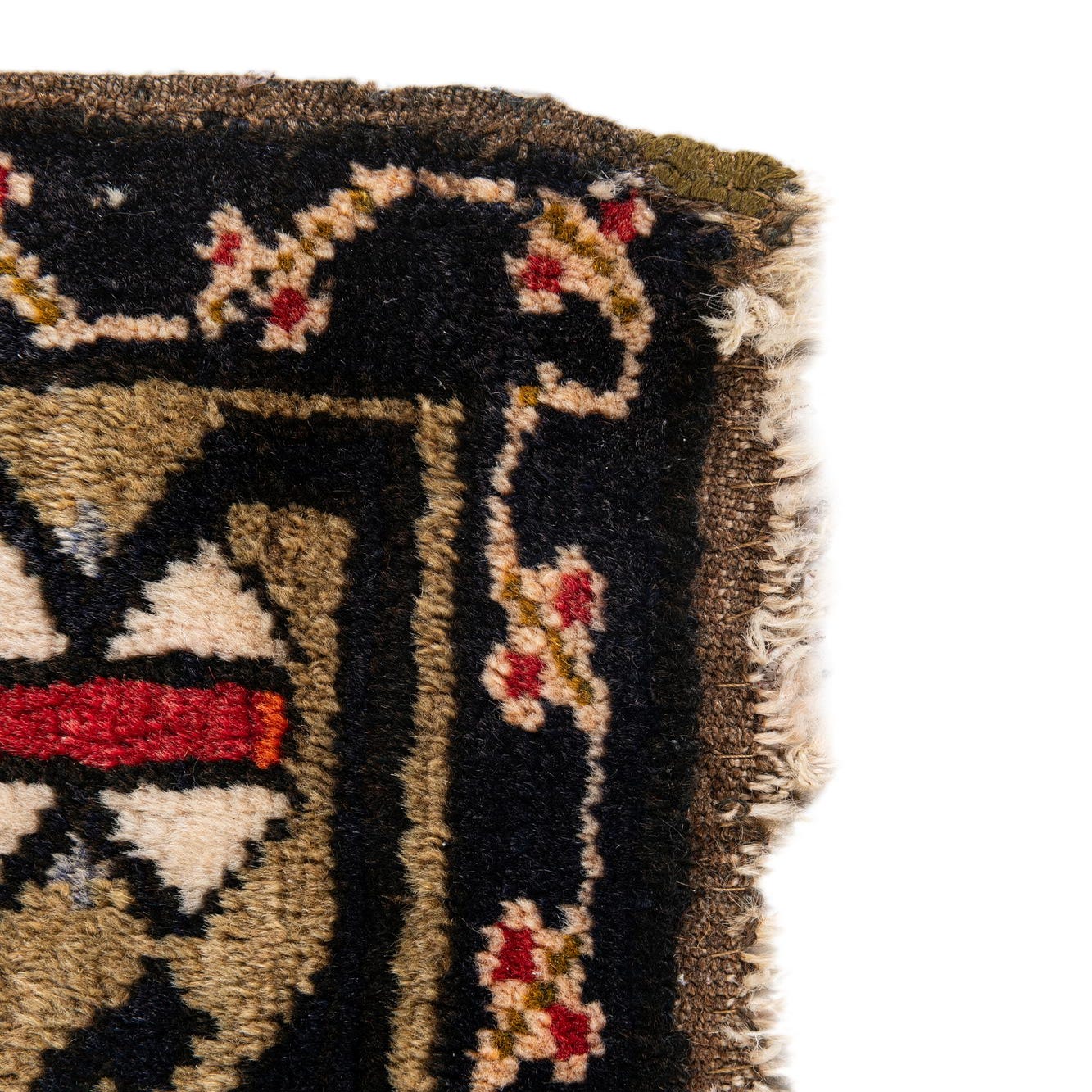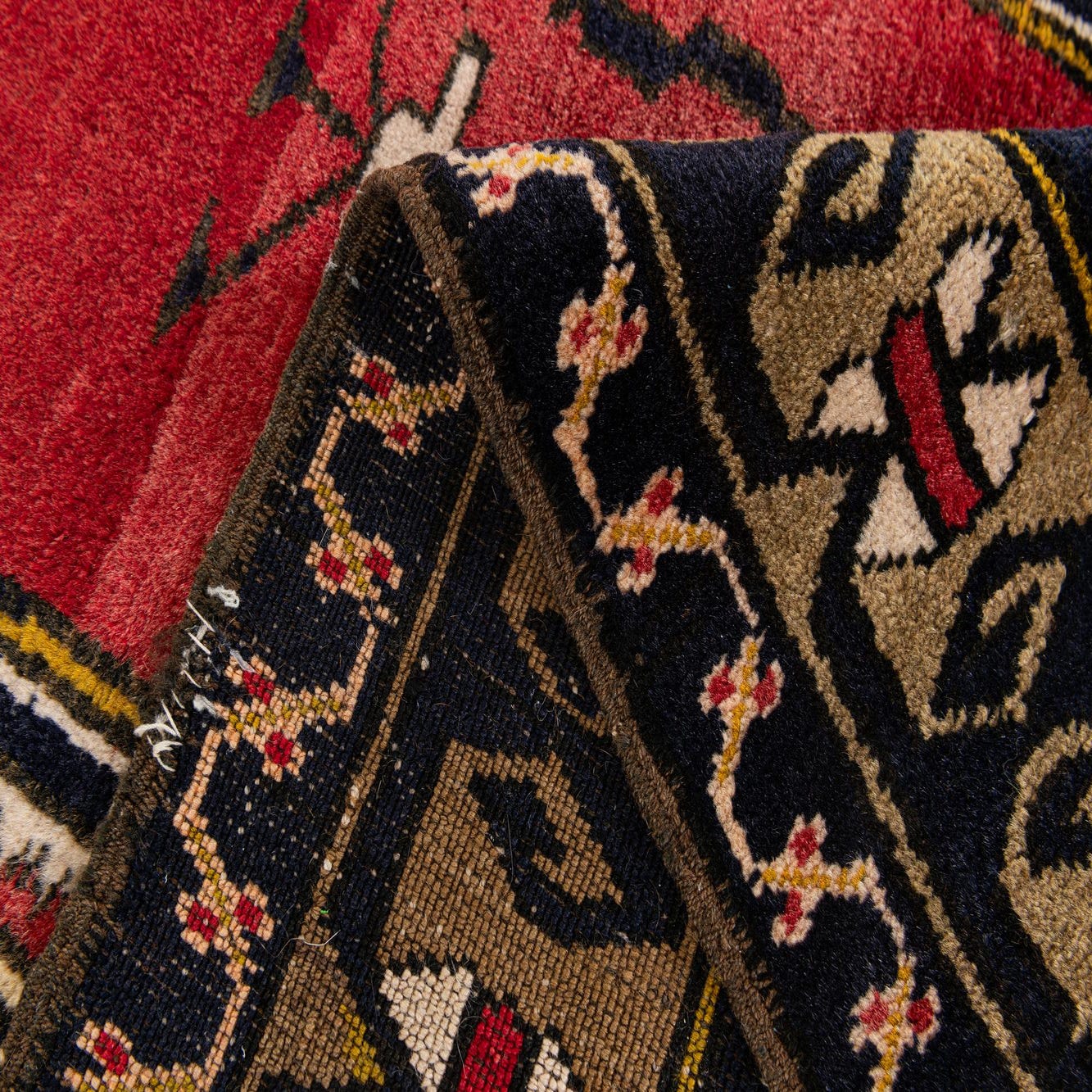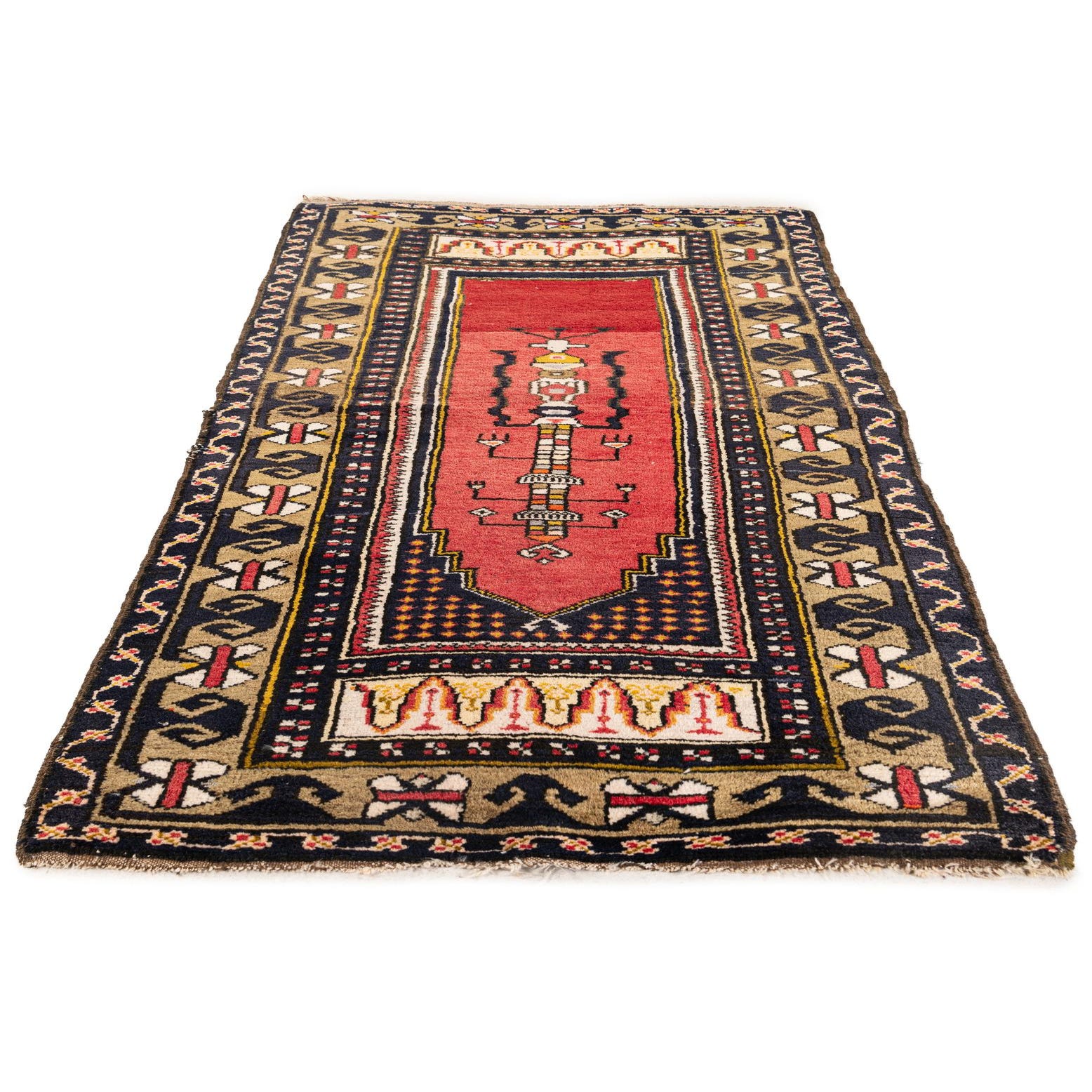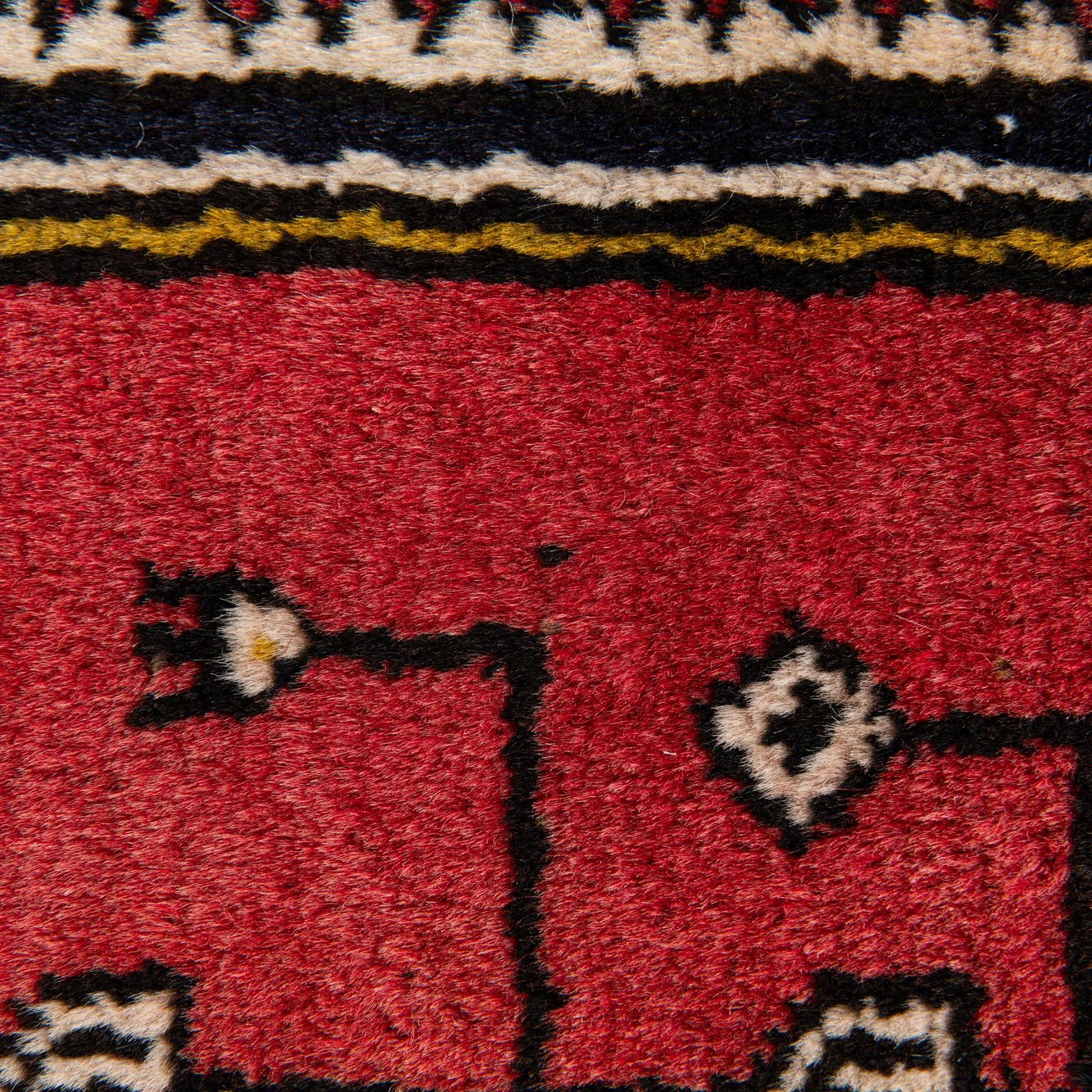 Primary color is Red. Colors in this rug include: Red, Black, Olive, Ivory, Yellow.