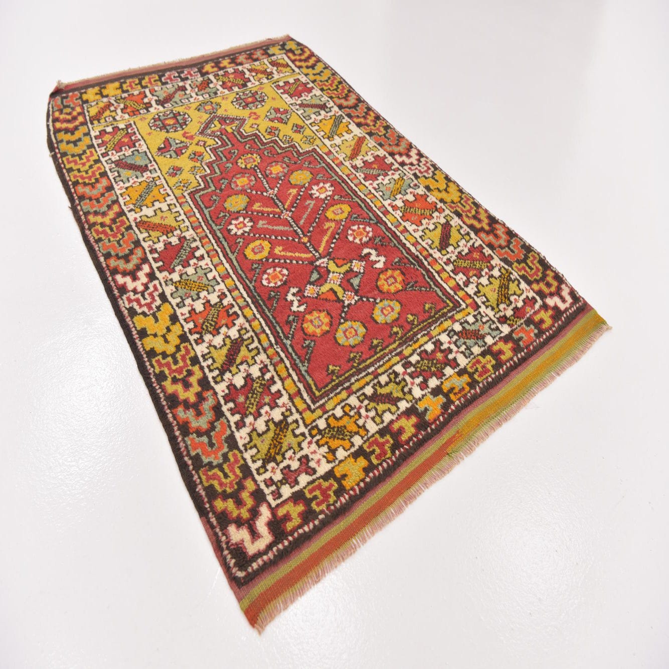 A 3x5 rectangular Anatolian wool rug featuring a rich red field with a tree-of-life motif, bordered by intricate tribal patterns in gold, black, and white.
